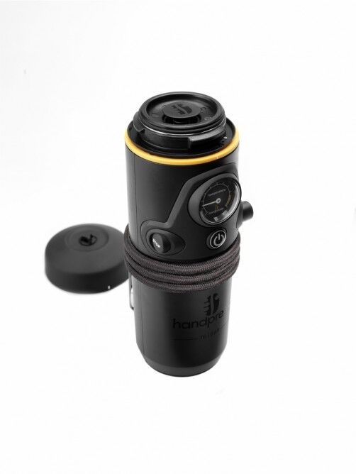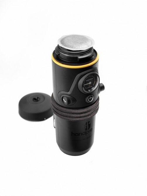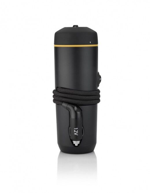 Apenas pesa algo menos de un kilo (880 gramos, exactamente) y el Auto Handpresso se parece bastante a una de esas botellas de agua que se llevan en una bicicleta. Pero cualquier otra similitud termina ahí. Luego tan solo hay que añadir 53 ml. de agua, una cápsula de café circular de la marca y conectarlo a la toma DC de 12V del mechero más cercano tras apretar la rosca de la tapa. En dos minutos, gracias al vapor de agua moviéndose a 16 bares de presión, estará listo un café expreso perfecto.