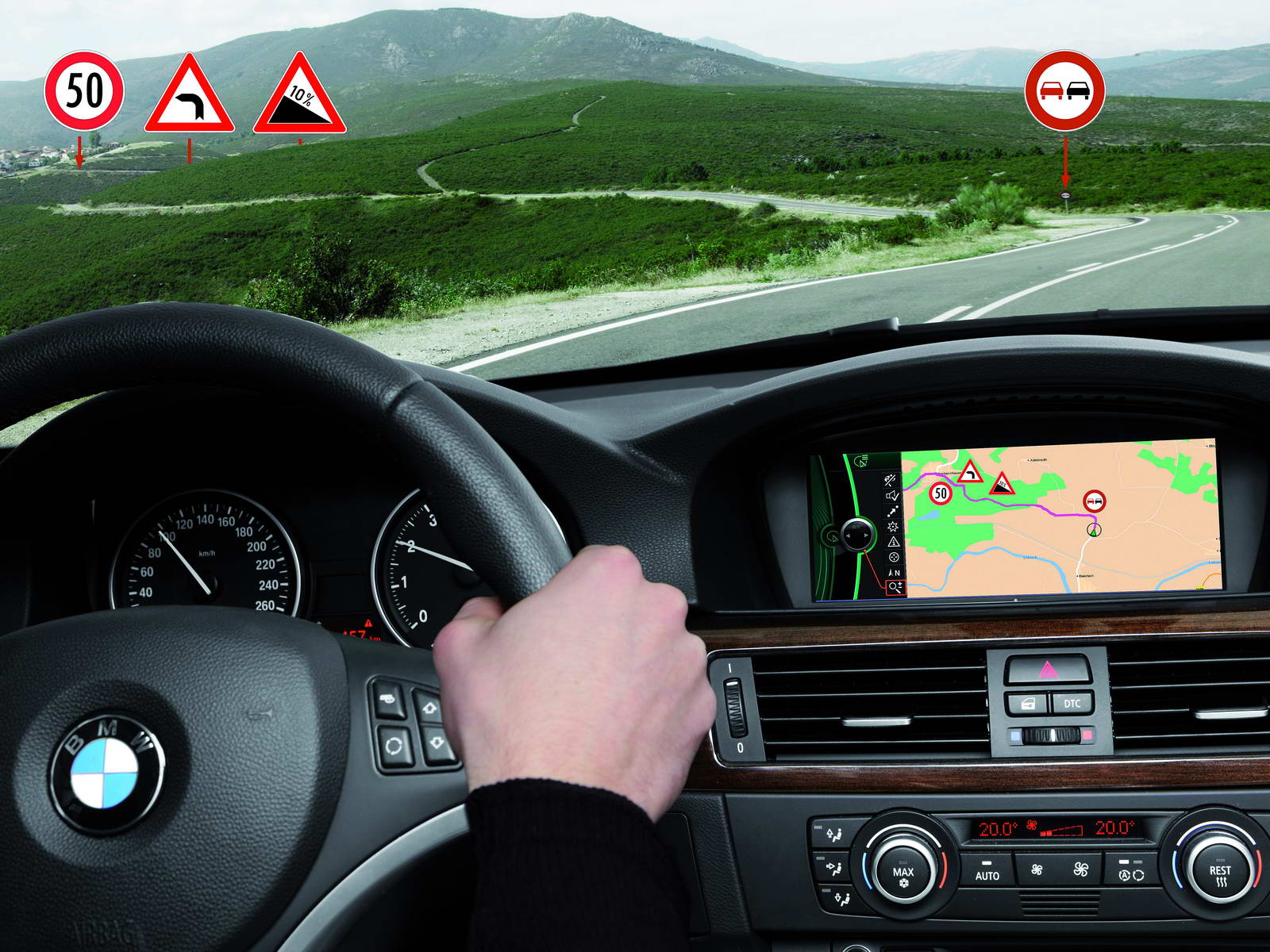 Por último queda la parte de mostrar al conductor dicha información. Tanto en el caso de BMW como en el de Opel, el límite de velocidad vigente en cada momento se muestra en la instrumentación o proyectada sobre el parabrisas (Head-Up display), como en los aviones de caza o en el nuevo Saab 9-5 que probamos. La indicación se actualiza automáticamente en el momento exacto en que el coche rebasa la señal de la nueva limitación.