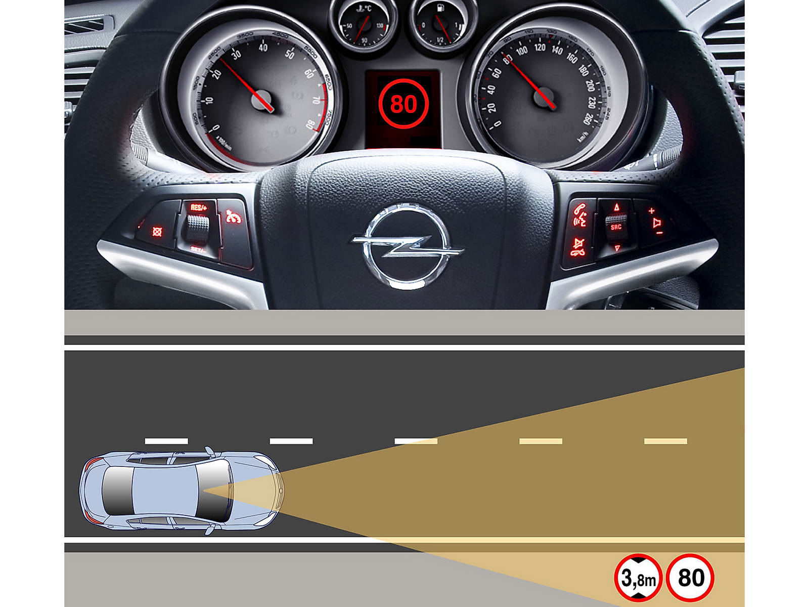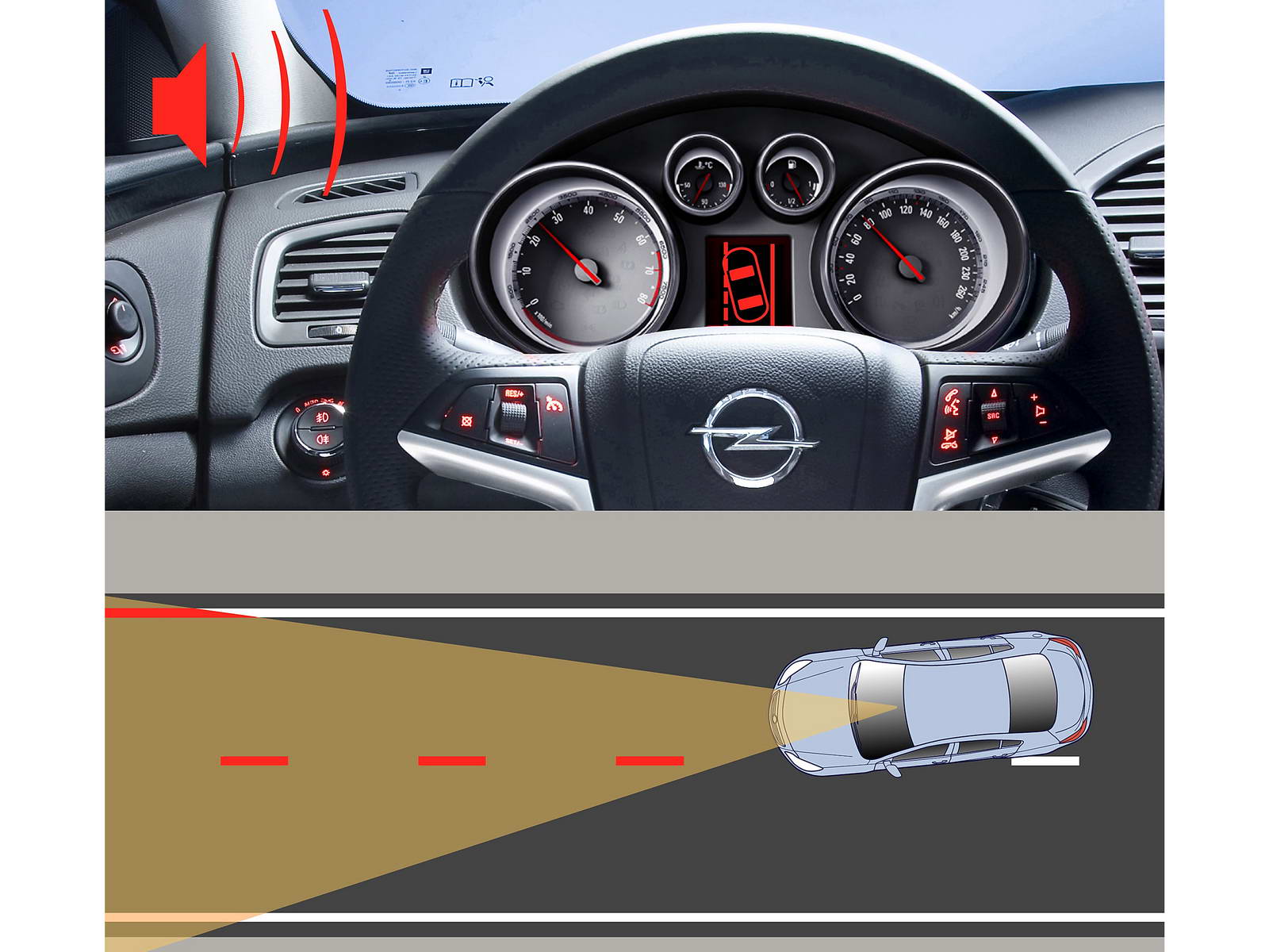 Por añadidura, el dispositivo Opel Eye cuenta con el sistema de aviso de cambio involuntario de carril, que alerta al conductor cuando de forma no intencionada abandona el carril por el que circula. Esta función ayuda a evitar situaciones peligrosas, como puede ser el caso de que un conductor se quede dormido al volante. El sistema avisa con una señal acústica y con un icono parpadeante en el cuadro de instrumentos.