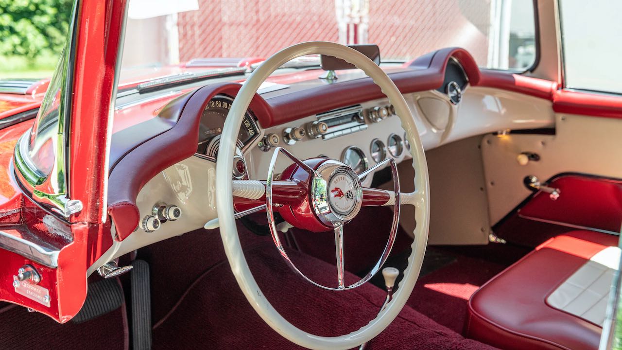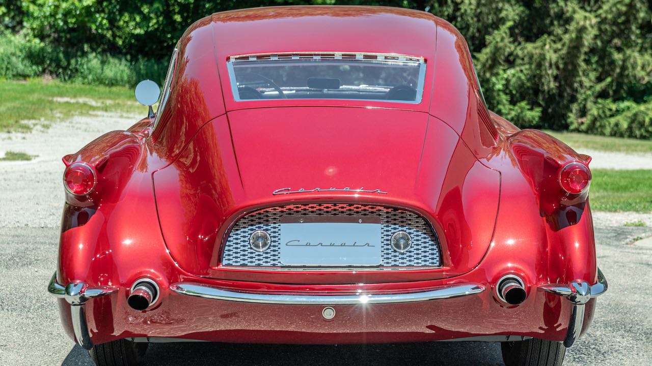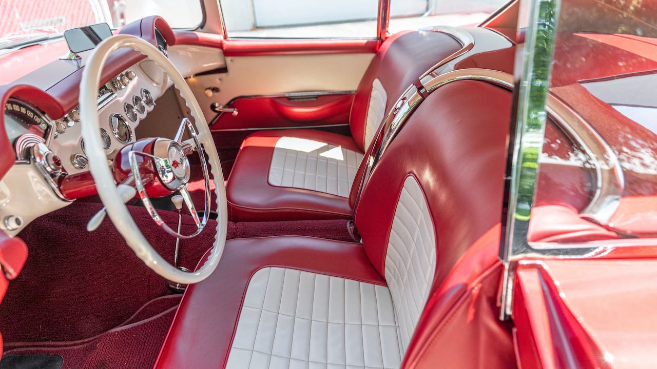 Tomando como base un Corvette original de 1954. todos los paneles de la carrocería fueron hechos a mano en fibra de vidrio, al igual que el prototipo original. Los únicos dos paneles que quedan del automóvil original son los guardabarros delanteros. En rojo con el interior blanco, como el modelo primigenio.