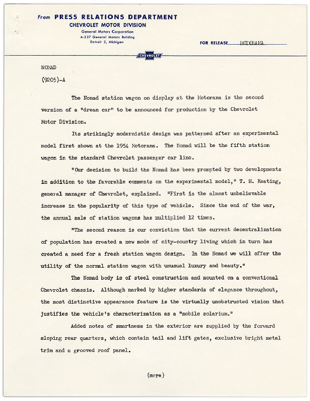 Chevrolet quería destacar en esa presentación su pasado fabricando coches con carrocería familiar. Surgió en 1957, basado en el vehículo experimental que Chevrolet había mostrado en el Motorama de 1954, tres años antes. Después de los buenos comentarios que había tenido entonces, la marca americana decidía que el Nomad se convirtiese en el quinto modelo con carrocería station wagon en la gama Chevrolet de producción.
