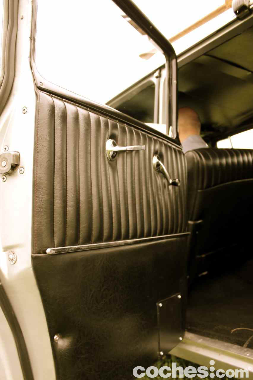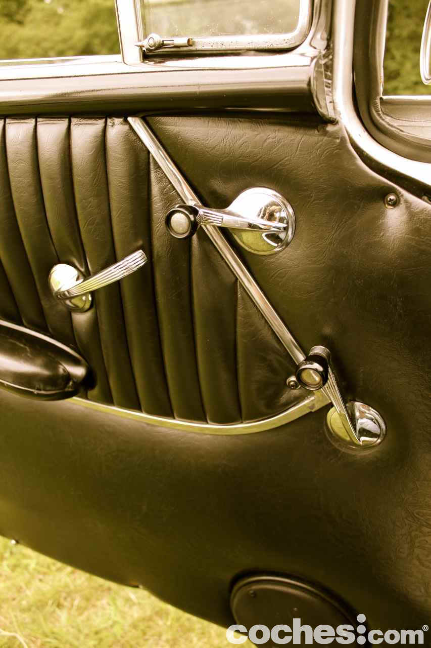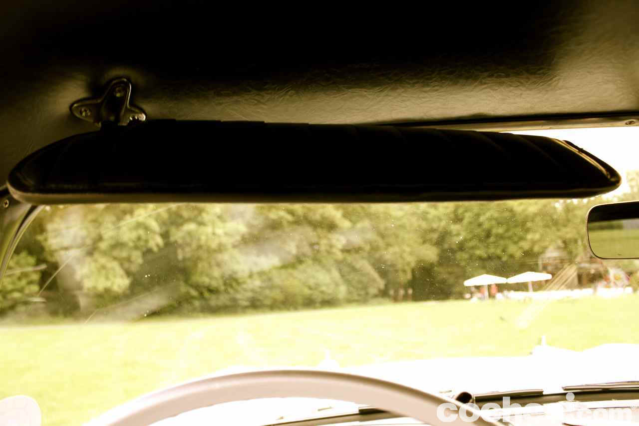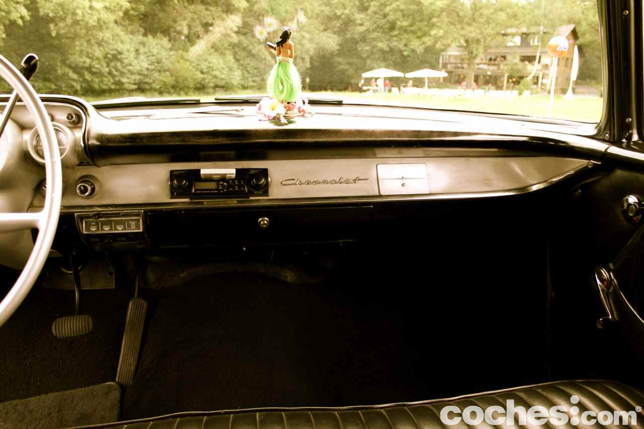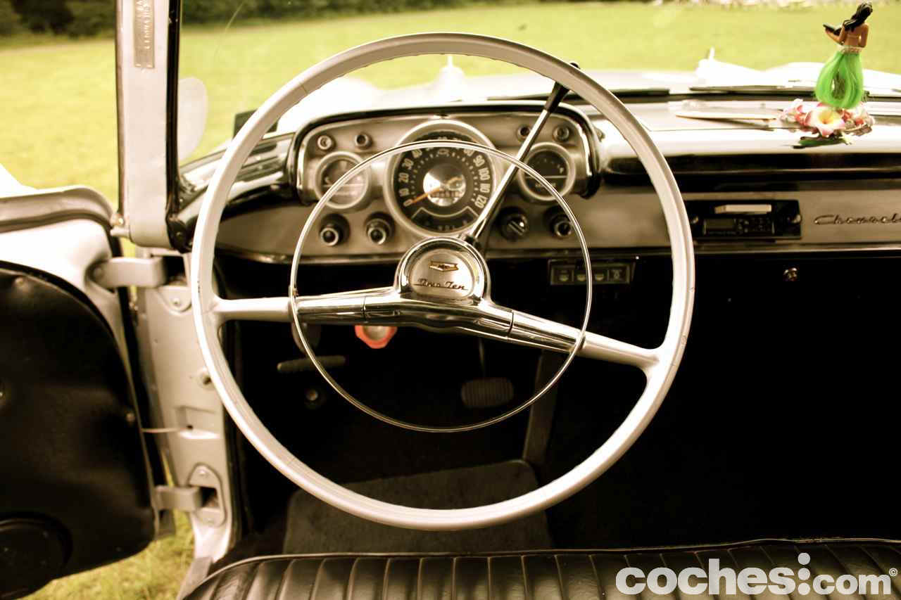 Una vez dentro nos resultó sorprendente lo amplio que resultaban los coches de entonces. Detrás parece que podrían caber incluso cuatro personas y delante, el típico banco corrido donde pueden ir tres personas sin problemas. No le falta ni un detalle de los coche de aquel entonces: Un volante gigantesco, la palanca de cambios montada a su lado, muy arriba, para facilitar cogerla... y hay una altura disponible al techo muy grande, sobre todo después de haber llegado allí en un coche moderno como el nuevo Cruze Station Wagon.