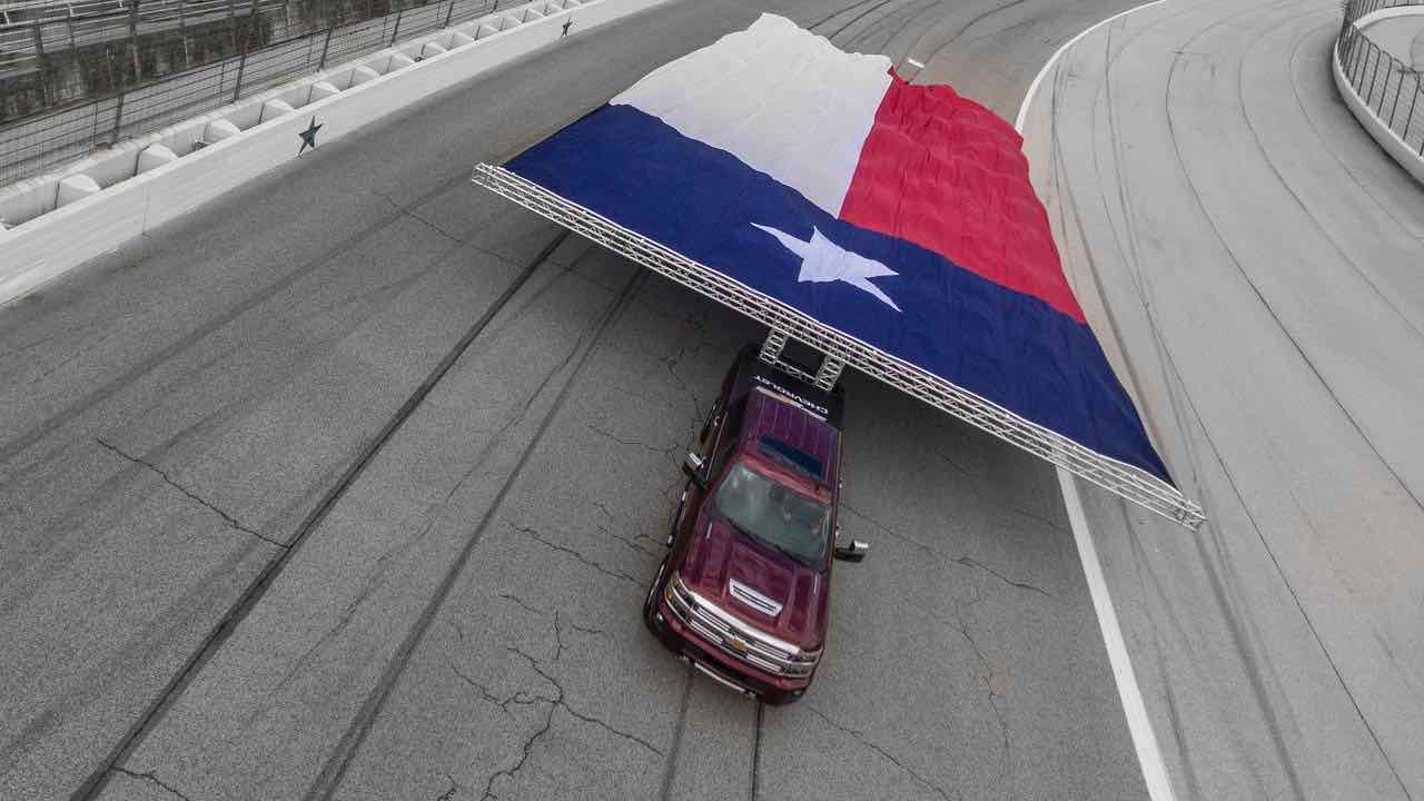 Sí, decimos banderas en plural porque Chevrolet también paseó una tela de idéntico tamaño con la bandera de Texas. Y es que el mercado tejano es clave en estos vehículos. Suponen una de cada cinco ventas de pick-ups en EE.UU. y el 15% de las más grandes. Es más del doble de las que se venden en Calofornia, el segundo mercado americano de este tipo de vehículos. Allí, uno de cada cuatro coches vendidos es una pick-up.