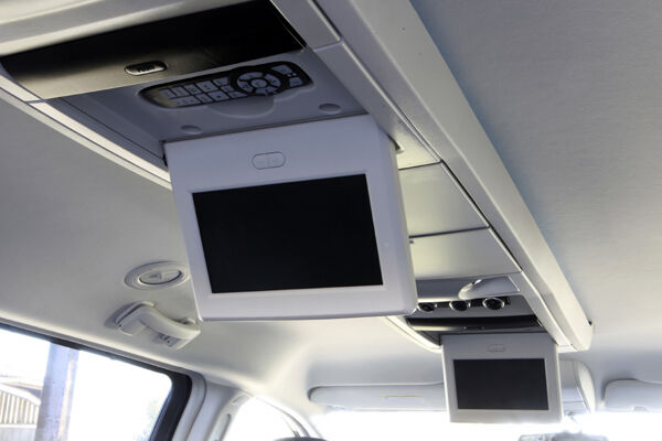 Para viajes largos, en el techo hay dos monitores conectados a un DVD que está en el salpicadero. En los laterales, hay conexiones auxiliares para usar otros reproductores o una videoconsola. Los monitores son independientes en el sentido de que pueden reproducir cosas diferentes.