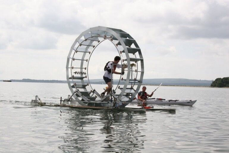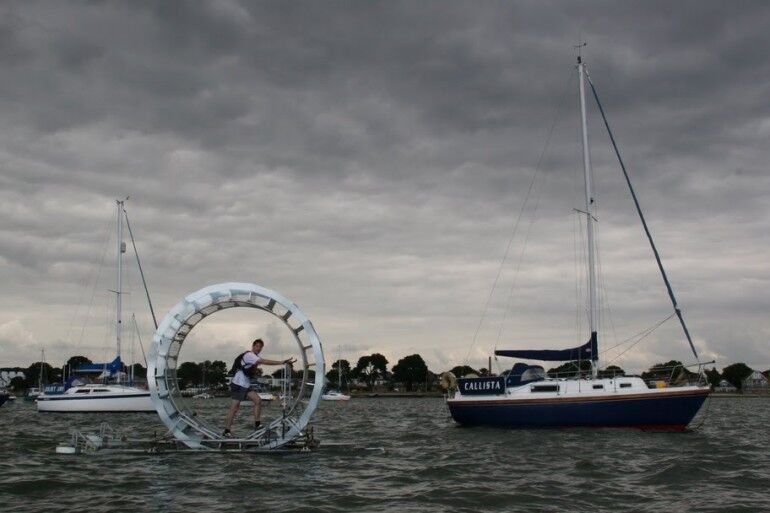 Pero a nosotros lo que más nos interesa es su invento. En principio la pensó para usarla a modo de ocio en lafo, con un bastidor, dos cascos y una rueda de paletas gigante. Soporta 200 kilos de peso y puede alojar dos adultos o un adulto y dos niños cómodamente. Aunque no superó su prueba de fuego, el rendimiento en el Mar de Irlanda ha confirmado que es muy estable incluso con olas de tamaño considerables.
