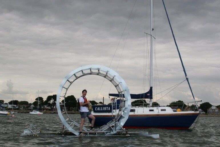 Chris Todd tiene 35 años y hace un mes intentó caminar 106 km por el mar en esta rueda-balsa gigante llamada Tredalo. Su plan de cruzar el Mar de Irlanda (desde Gales a la costa este de Irlanda, al sur de Dublín), no fraguó debido a las duras condiciones meteorológicas que obligaron Todd a abortar la misión tras ocho horas y media y 42 kilómetros recorridos. Le falló el timón, pero por suerte el barco de apoyo salvó a Todd, y le salvó de caminar 48 horas seguidas, «como correr unos diez maratones«, asegura.