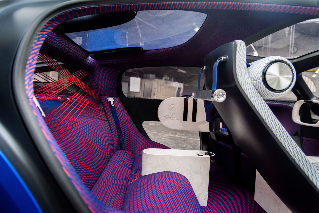 En habitáculo de este Citroën 19_19 Concept también está lleno de facilidades para que el viaje sea placentero. No hay ningún asiento igual a otro, cada uno de ellos tienen una forma y un propósito diferente. Es muy minimalista y no hay prácticamente elementos en el salpicadero, la pantalla se proyecta sobre el parabrisas. En este entorno lo que pasa prácticamente desapercibido es el pequeño volante, que se podrá esconder cuando el coche ruede en modo autónomo.
