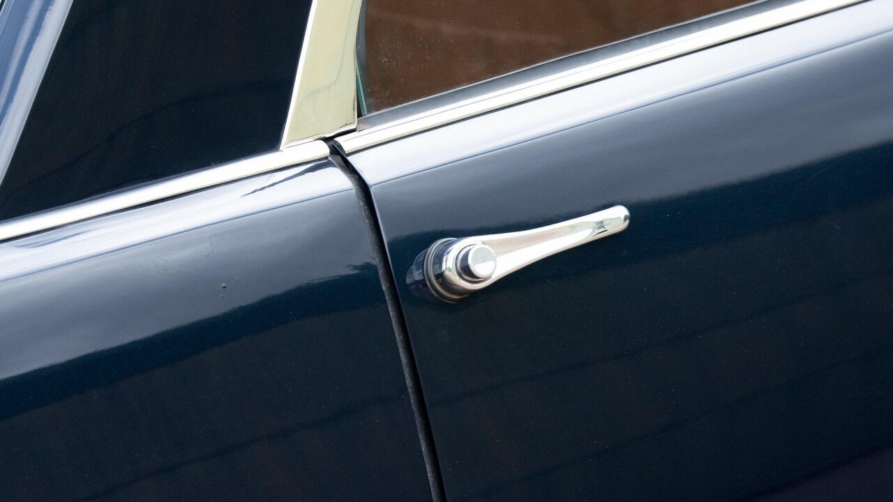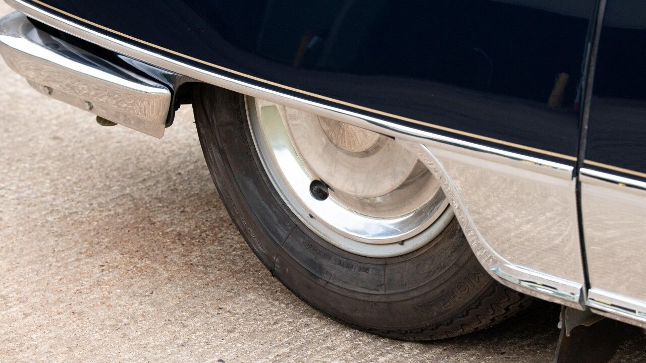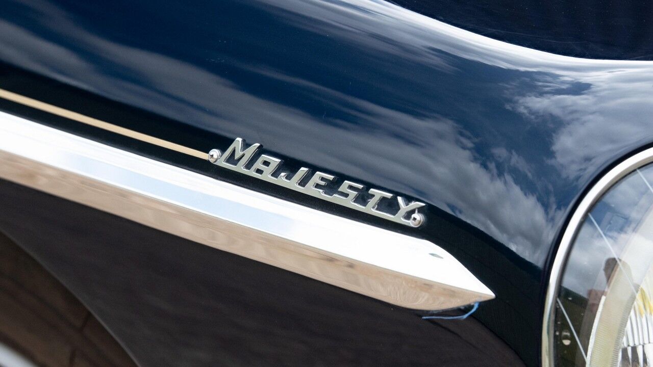 Hay mucho brillante en la parte inferior de la carrocería, una elegante franja cromada en el perfil que destaca por las insignias de “Majesty” y las cubiertas de las ruedas (tapacubos) en aluminio pulido, que contrastan con el tono Midnight Blue. El equipamiento incluye aire acondicionado con ventilaciones delanteras y traseras, ceniceros para todos los pasajeros, radio, un reloj montado en el salpicadero y una tapicería totalmente personalizada.