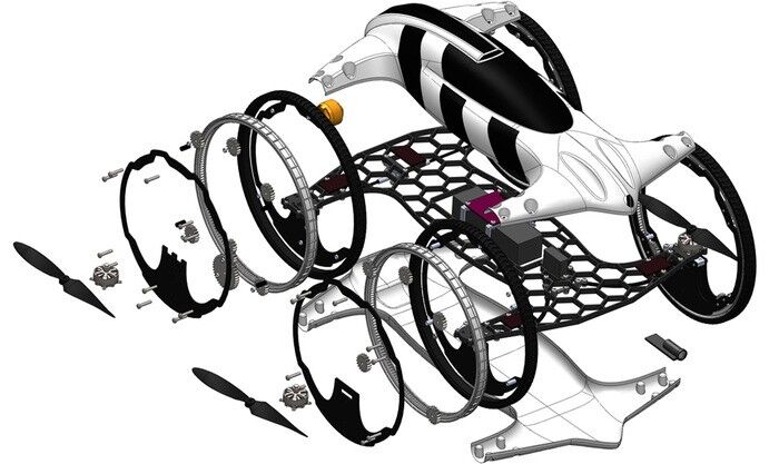 El vehículo está fabricado en policarbonato resistente, y los cuatro anillos que son capaces de elevarlo son los que funcionan como ruedas, a los que su inventor llama anillos de conducción, ya que cada anillo está impulsado no por un eje desde su centro, sino por mecanismos dentados en la parte inferior de la llanta. En el centro de los anillos de siete pulgadas se ubican cuatro hélices, que permiten al vehículo levantar el vuelo sobre la marcha.