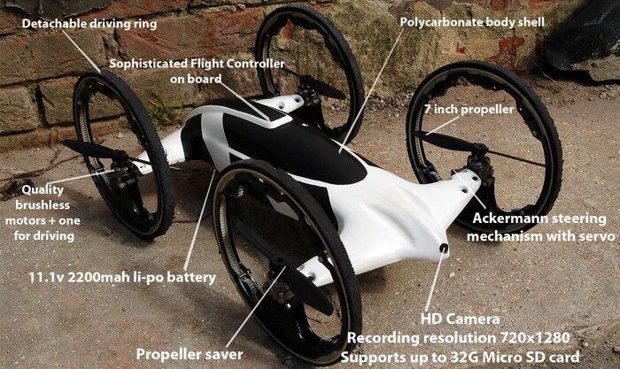 Los anillos de conducción son flexibles y desmontables, por lo que no se estropearán cada vez que B tenga un aterrizaje duro. Las hélices son también flexibles... por la misma razón. Su energía la proporciona una batería de polímero de litio de 11.1 voltios, que proporciona hasta 15 minutos de uso, combinando conducción y de vuelo por carga. Monta una cámara de vídeo de 720p, que graba directamente a una tarjeta Micro SD todo el recorrido.