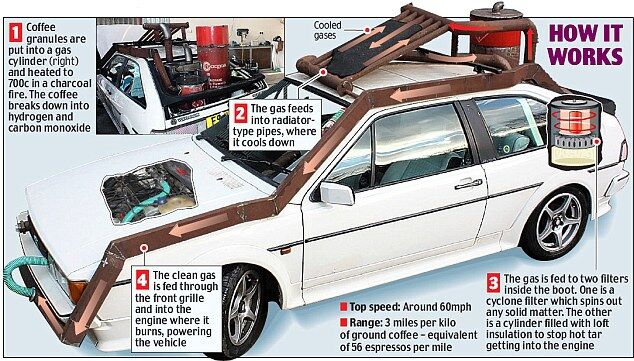Y otro esperimento parecido fue el del Cafe Racer. Modificaron un Rover que podía ser movido con residuos de café gracias a la gasificación. Esto es lo que hicieron: