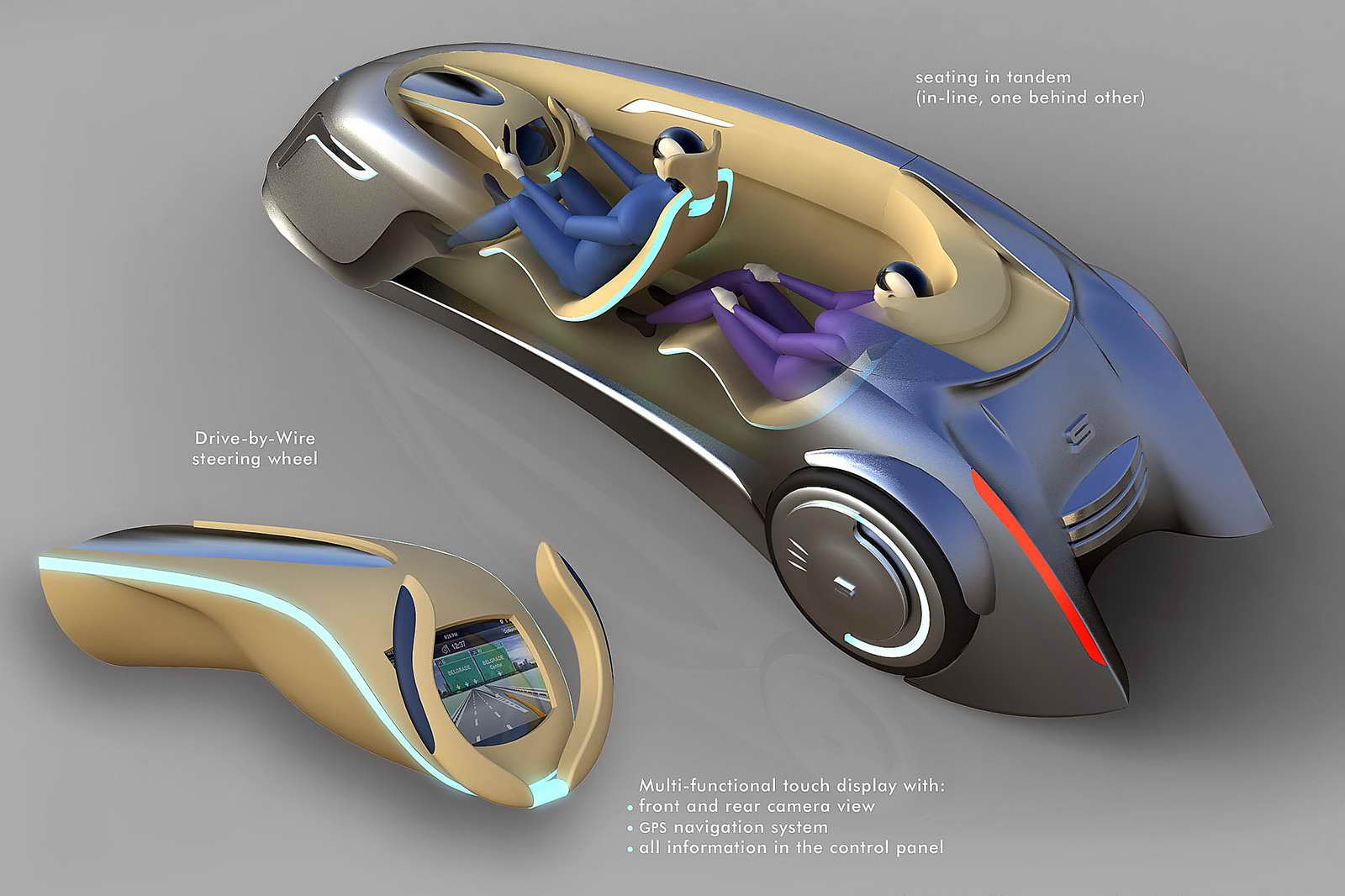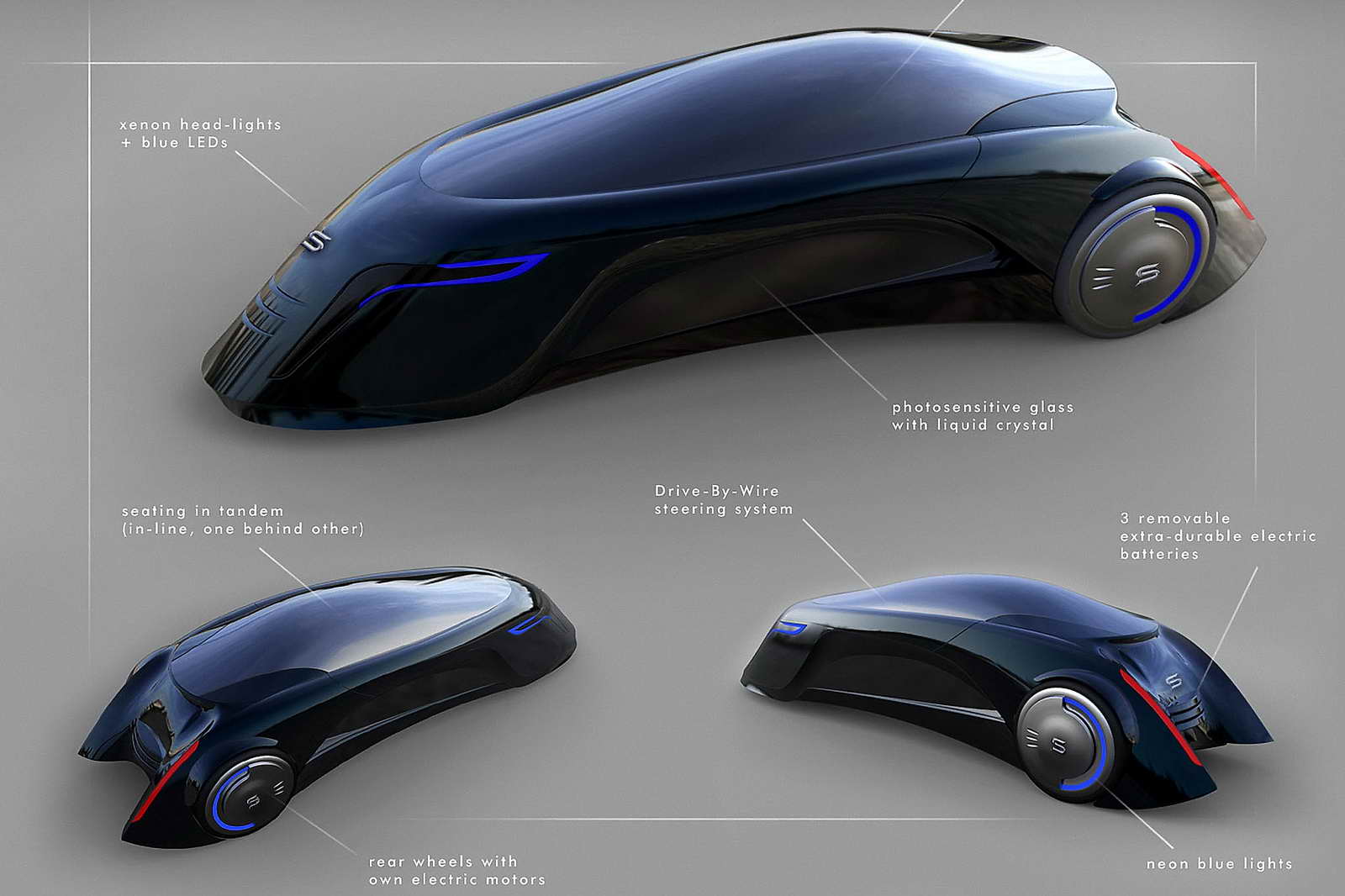 Según las especificaciones dadas a conocer, se trata de un biplaza eléctrico, con los ocupantes colocados en tandem, como si de un avión de caza se tratara, con una aerodinámica excelente, y con dos motores, cada uno de los cuales propulsaría una de las ruedas traseras. Asimismo estaría dotado de un piloto automático, para facilitar la conducción cuando las condiciones del tráfico lo permitieran. Además dispondría de una gran autonomía, de alrededor de 300 km (a velocidades normales) para poder afrontar largos desplazamientos sin problemas, y de unos 190 km en conducción a alta velocidad.