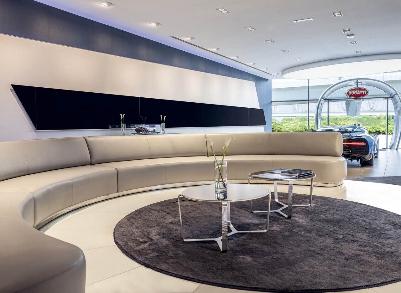 La entrada al concesionario es una enorme herradura de cuatro metros. Se ha elegido este elemento porque ha marcado en la historia de la marca y porque está presente en la parrilla de casi todos los modelos. De momento en su interior solamente cuentan con una unidad del Bugatti Chiron, que podrá ser admirada desde algunos de los muebles de lujo que forman parte de la Bugatti Home Collection.