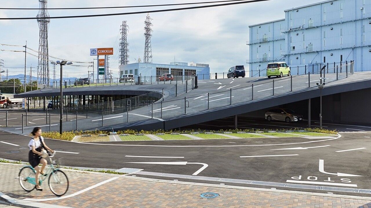 Esta solución permite que un coche viaje a través del techo y determine el tamaño del edificio y su grosor a través de un estudio paramétrico en el que se vincularon la sección transversal y el plano. Cambiamos el tradicional sistema de ejes X, Y, Z a una nueva geometría que no solo tiene la dimensión de una persona, sino que también está en una nueva escala que incluye el tamaño y el movimiento de un vehículo mediante el radio de giro o la pendiente. Toyota lo define como “una nueva geometría basada en la relación entre las personas, los edificios y sus alrededores”.