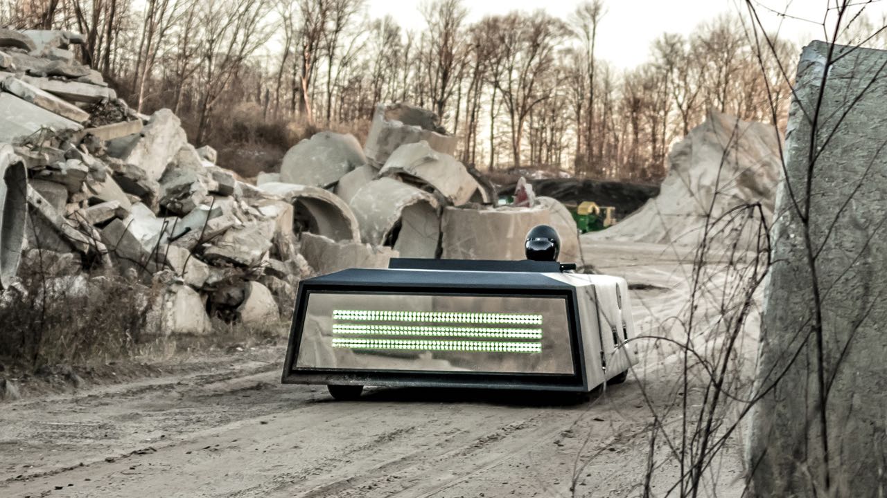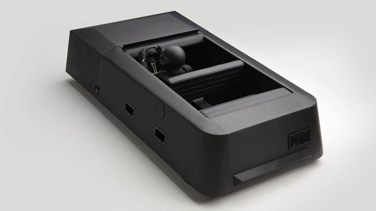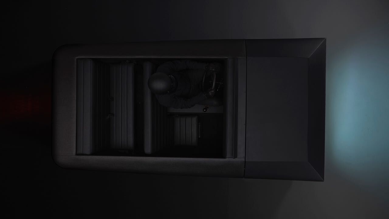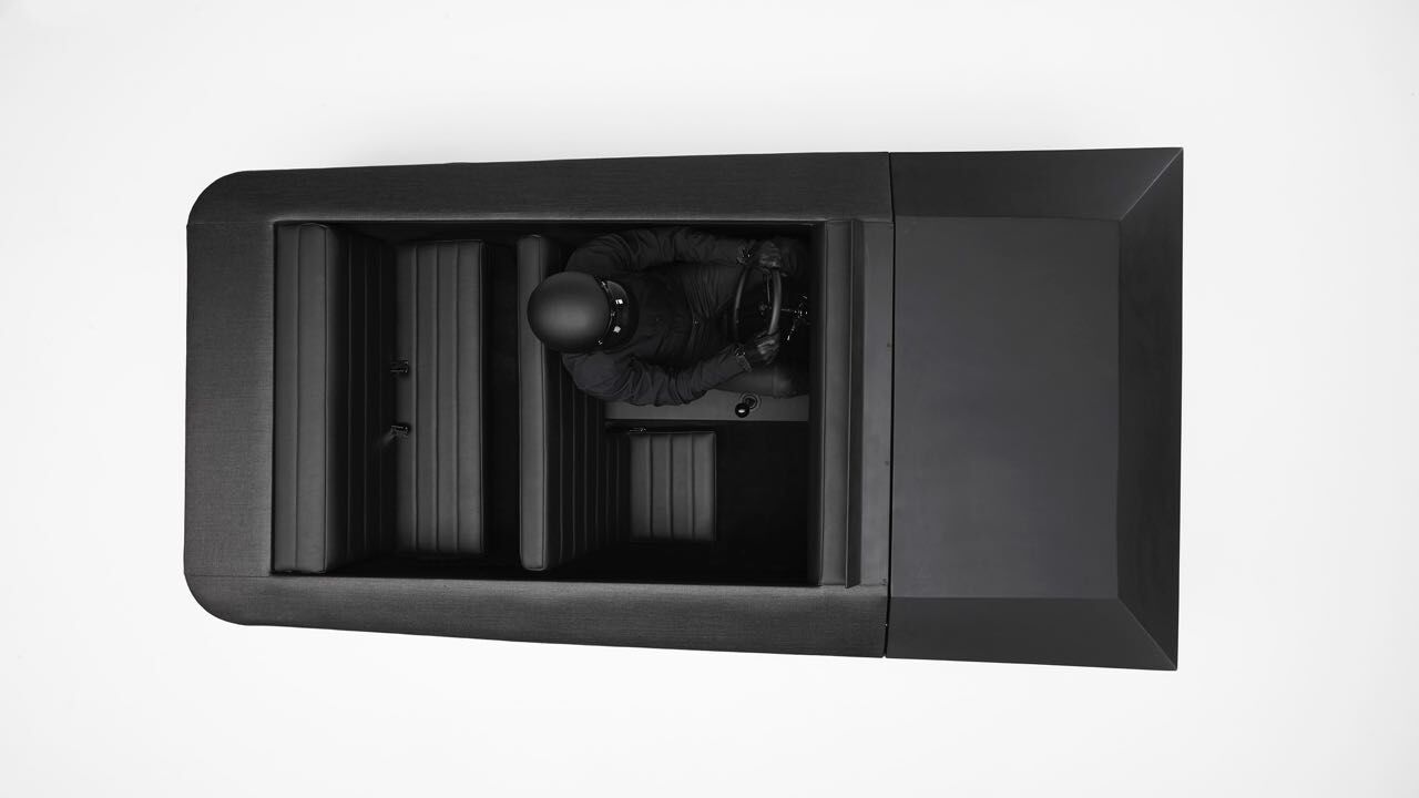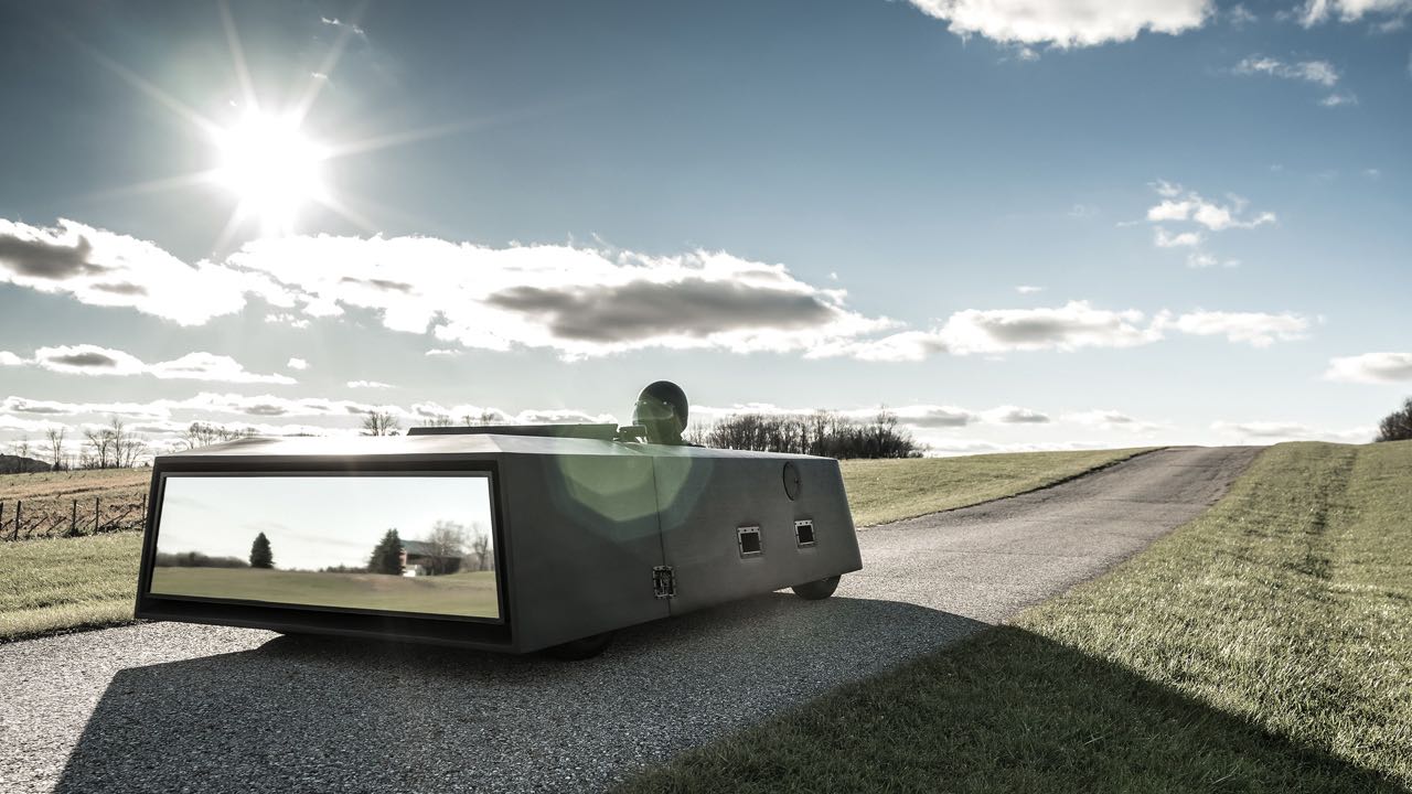 El cuerpo del coche no cuenta con adornos, tiene un volumen trapezoidal bajo negro mate. Al frente predomina dos espejos que ocupan todo el largo del vehículo que reflejan lo que tenemos al rededor del coche. Ambos espejos están angulados de tal manera que no puedan cegar a otros conductores con sus destellos.