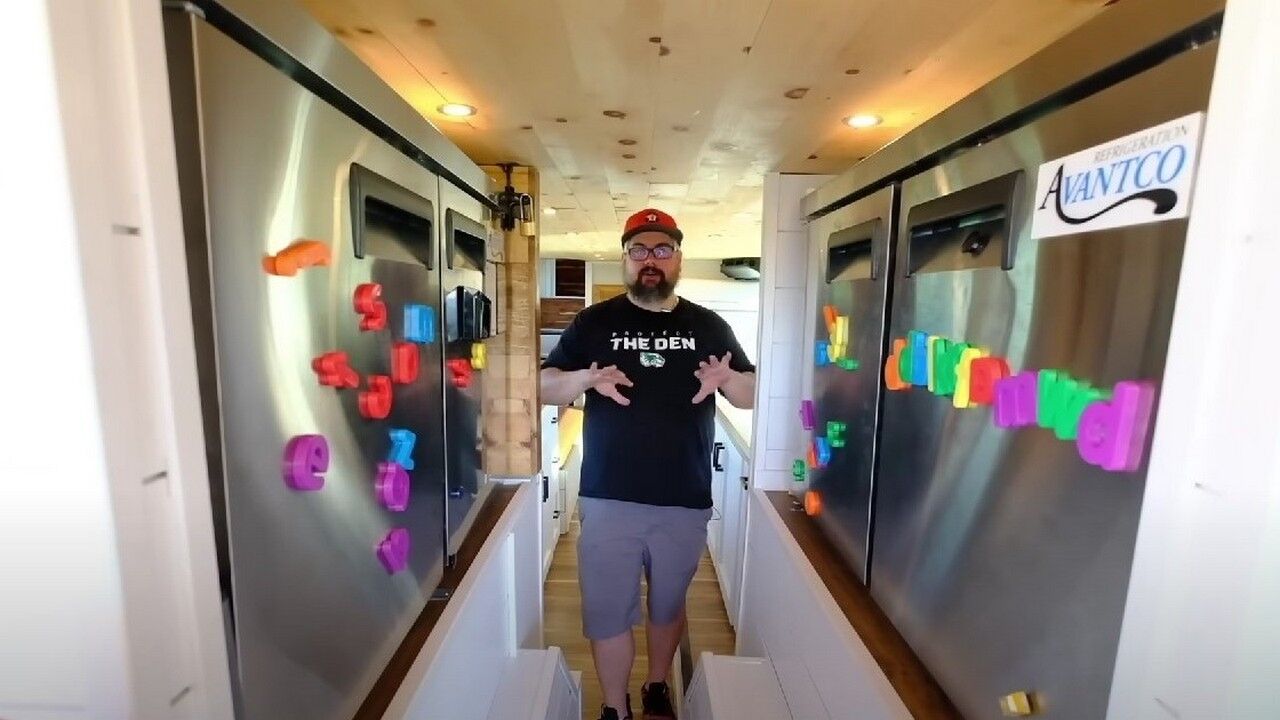 Como tal, el vehículo mide unos notorios 13,7 metros de largo y 3,9 m de alto, con suficiente espacio para mamá, papá y sus seis hijos. Los dos renovaron el autobús y lo convirtieron en su casa ideal de dos pisos sobre ruedas. El área de la cabina es bastante espaciosa y también sirve como oficina para el bus danés. Ahí es donde guarda el ordenador y la mayoría de los equipos que usa. Unos pasos más adelante hay una cocina, con una gran nevera a un lado y un congelador en el otro. Tampoco falta el fregadero, una placa de dos fuegos y un horno.