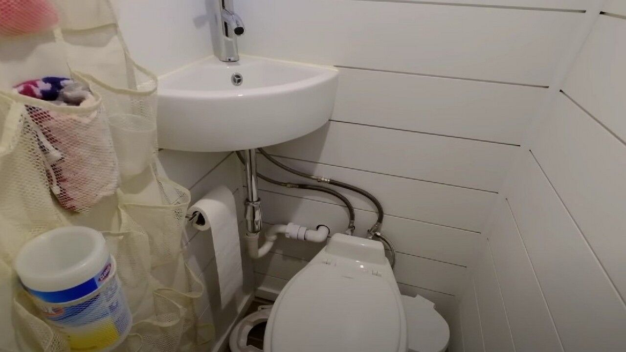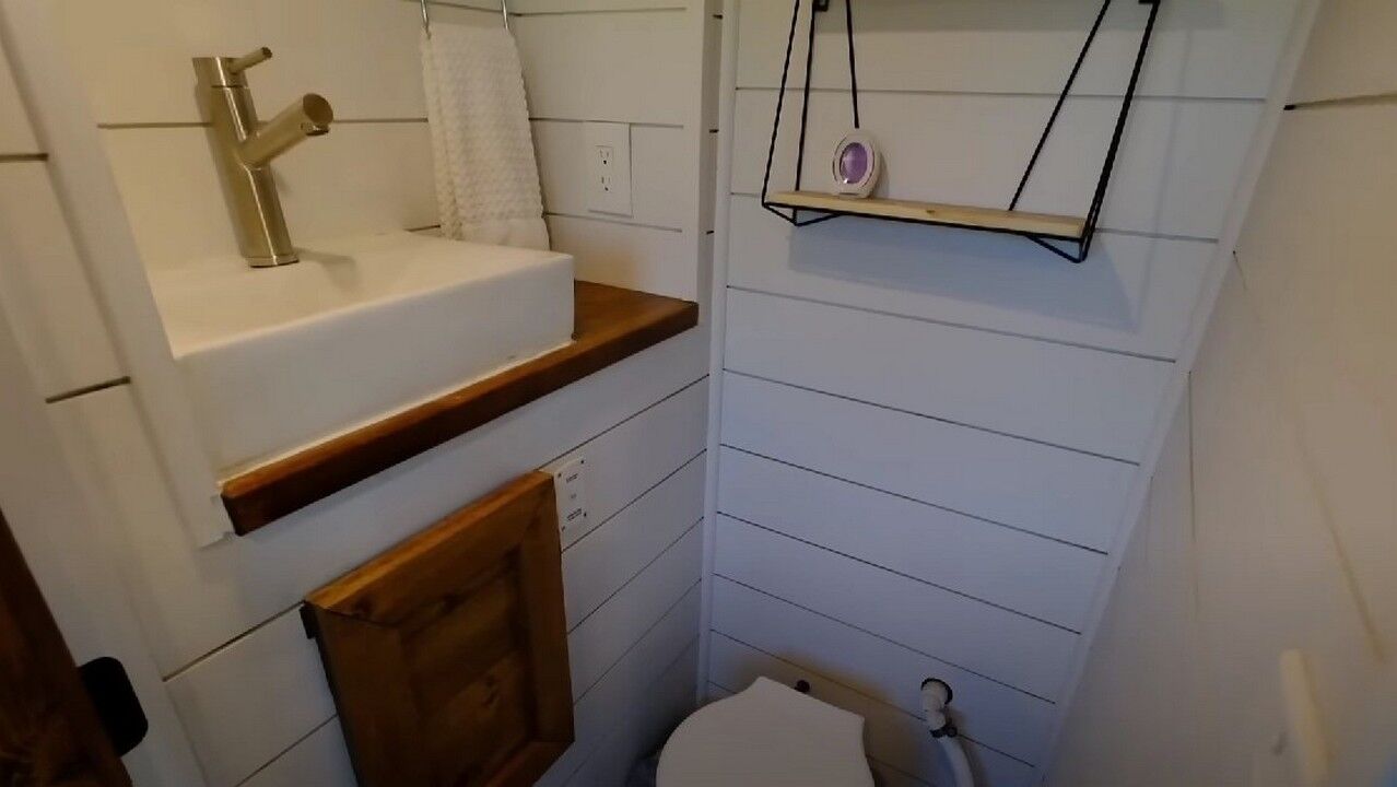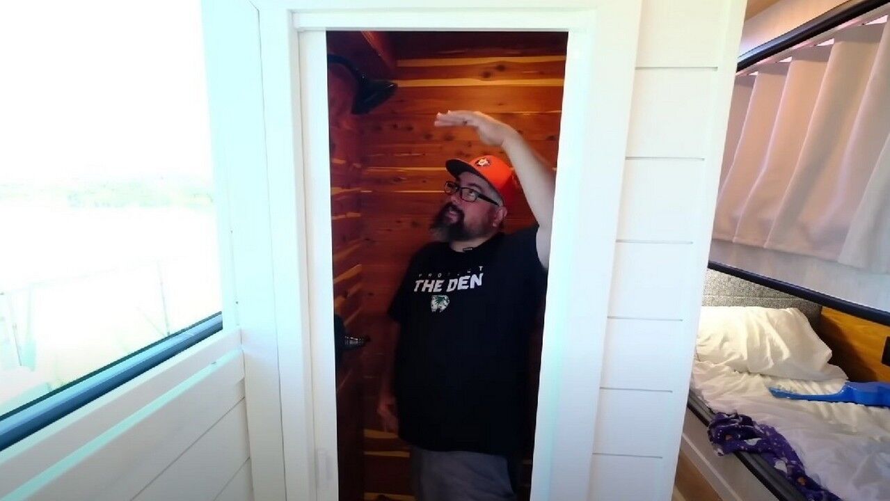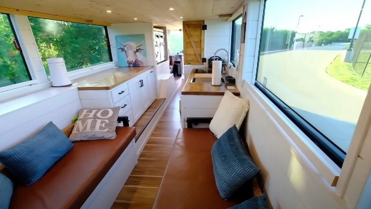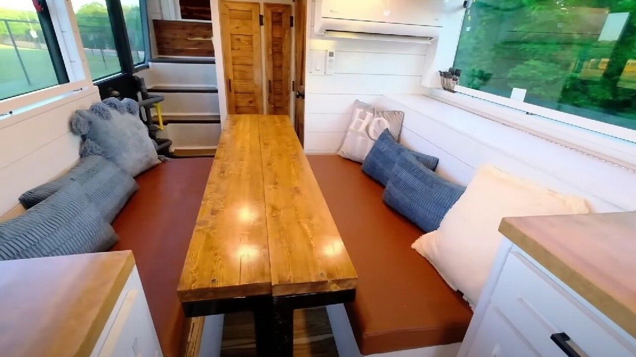 Detrás de la cocina hay un comedor que se llena de luz gracias a los grandes ventanales del autobús que incluye a dos sofás. Uno de ellos tiene un respaldo que se levanta para hacer una mesa, mientras que detrás del otro hay un enorme espacio de almacenamiento: ahí es donde la familia guarda comida no perecedera y otras pequeñas cosas. Hacia la zaga, hay uno de los baños. Sí, has leído bien, la plataforma tiene dos baños, que están separados de la ducha. Y si te preguntas dónde está, bueno, está justo entre los dos niveles del autobús.