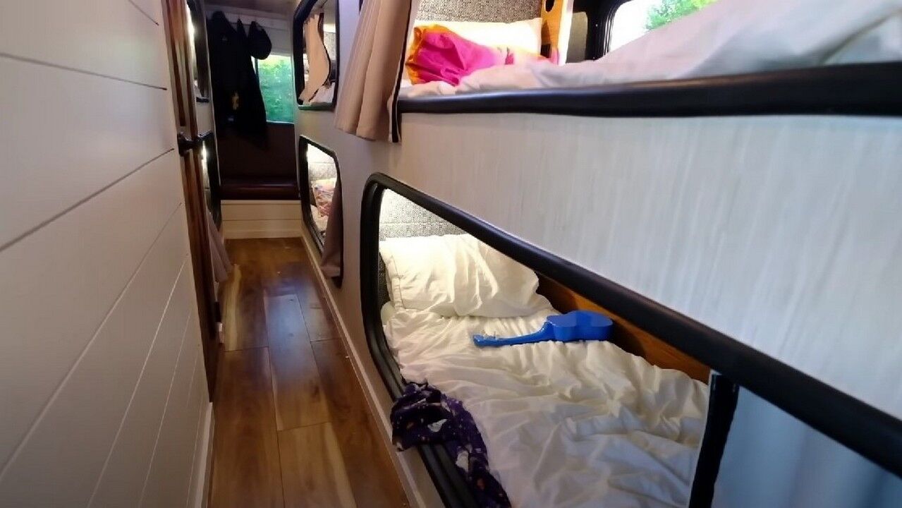 Arriba hay una “sala” combinada para la lavadora y la secadora, y una sutil área diseñada para la lavandería. Unos pasos más adelante están los dormitorios de los niños. Todos ellos tienen su propia litera, que está personalizada para adaptarse a su estilo y necesidades. Más abajo en el pasillo está el segundo baño. Comparado con el de abajo, el área es un poco más pequeña, pero hace el trabajo. En la parte trasera es donde guardan su ropa. También hay un pequeño asiento que se puede usar para leer o relajarse. Hacia el frente, la sala de estar.