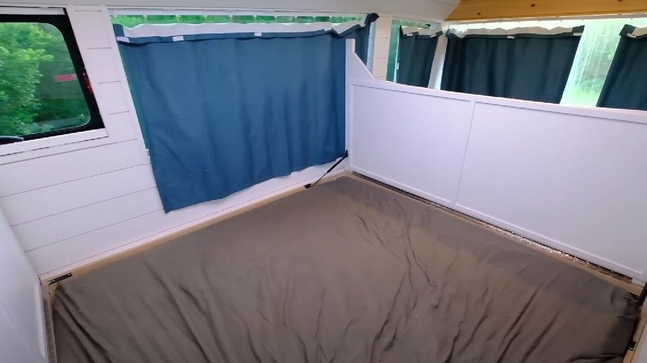 Al igual que el comedor de la planta baja, este espacio tiene dos bancos grandes. Sin embargo, se colocan en un solo lado del autobús. Por supuesto, no puede faltar una mesa que se utiliza para estudiar o jugar juegos de mesa. Luego está el dormitorio principal, que incluye una cama de tamaño king que se pliega cuando los niños quieren tener más espacio para jugar. Desde el área del dormitorio, la familia puede acceder a la terraza de la “azotea”, la cual cuenta con una barandilla que los niños usan para colgar las hamacas y disfrutar al aire libre.