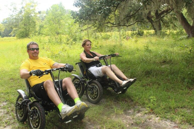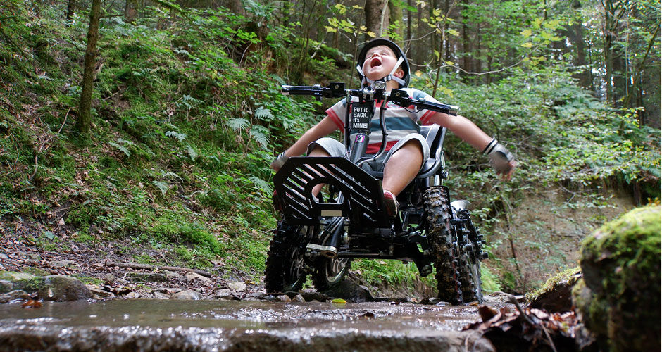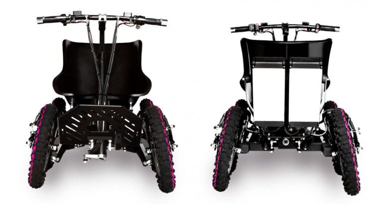 La estructura de este vehículo está hecha de una aleación de acero ligero, que mantiene a las cuatro ruedas de aluminio en contacto con el suelo en todo momento. Estas ruedas están revestidas de neumáticos todoterreno de 16 x 2,5 pulgadas y cuentan con frenos de disco hidráulicos. Además, posee dos baterías eléctricas de litio de 48 voltios que proporcionan una energía a cada uno de los cuatro motores de cubo de 1.000 vatios (uno en cada rueda). Esto permite a esta silla de ruedas todoterreno alcanzar una velocidad máxima de 19 km/h , en menos de dos segundos.