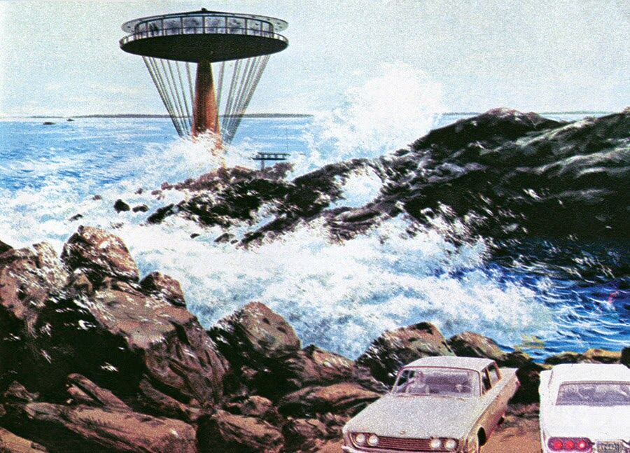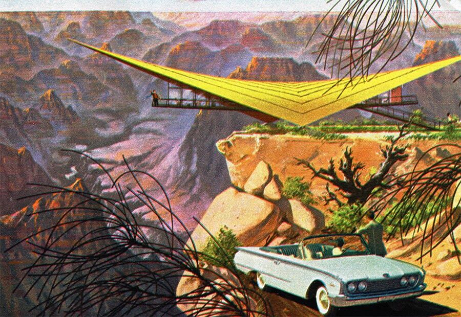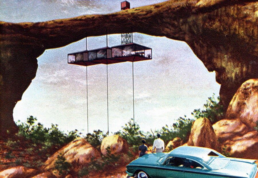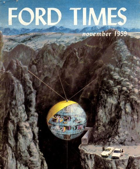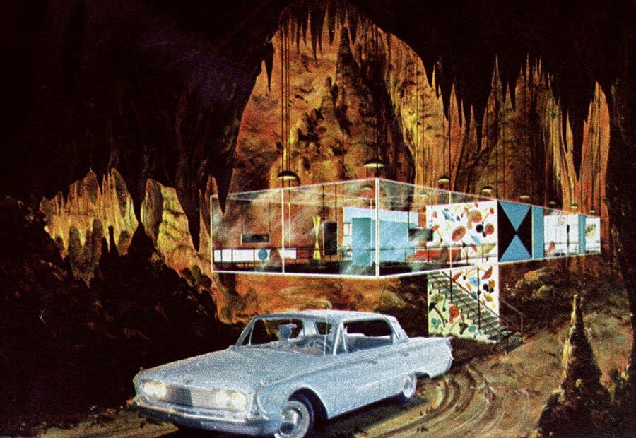 Inspirados en la filosofía del famoso arquitecto Frank Lloyd, estos bocetos vislumbran una especie de modernismo en línea con la idea de la ciencia ficción. Cubos minimalistas que se suspenden en el aire, formas geológicas o casas hechas totalmente de cristal, son algunos de los ejemplos. Eso si, con los coches de Ford siempre presentes y ocupando un lugar privilegiado.