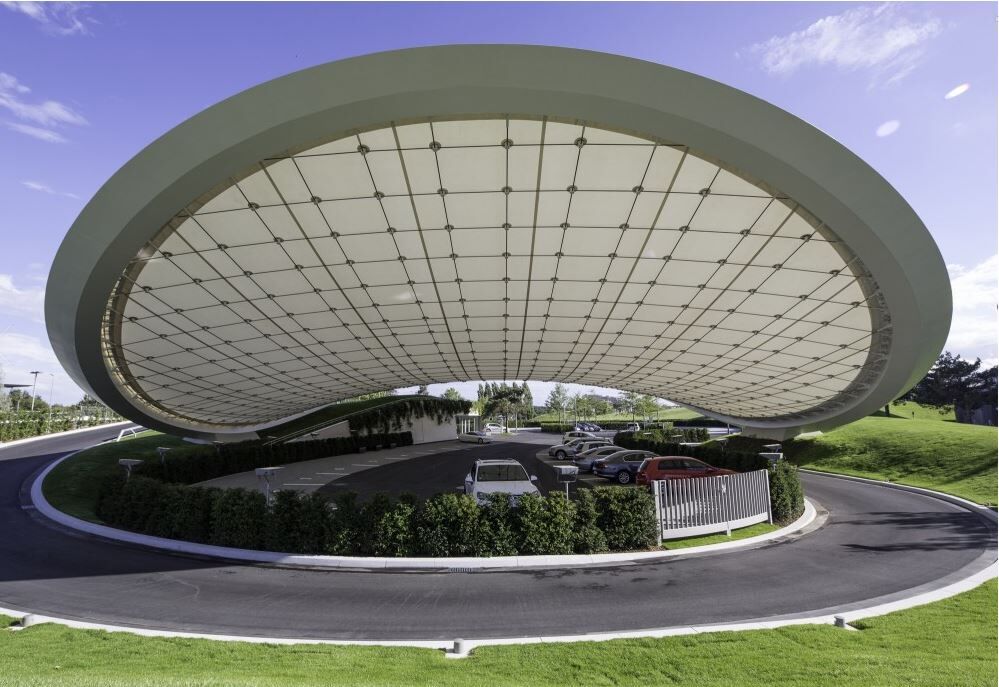 Pero, ¿cómo está construido? Esta original cubierta está construida a partir de una base de hormigón armado. El techo cuenta con un marco doble-curvado de chapas de acero soldadas y una estructura de cables de acero que atraviesan debajo.