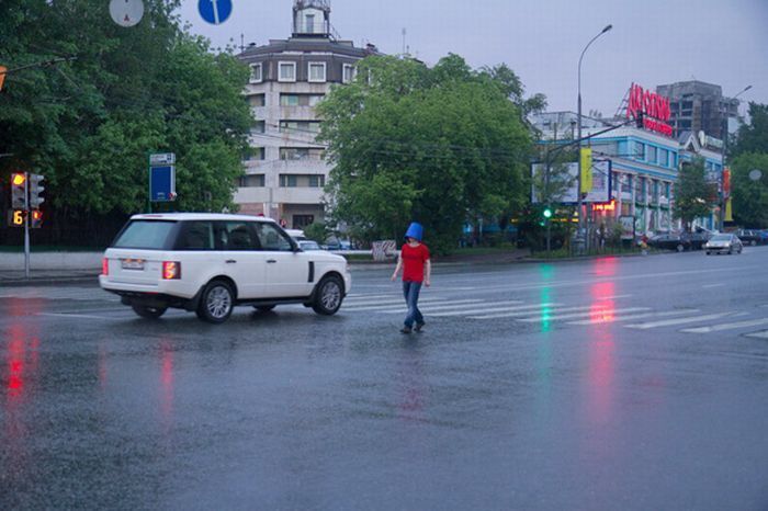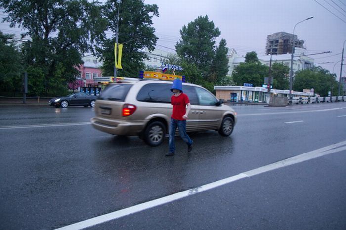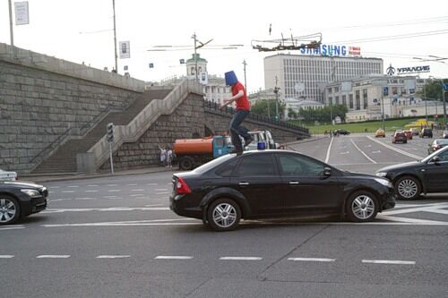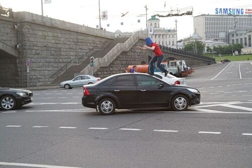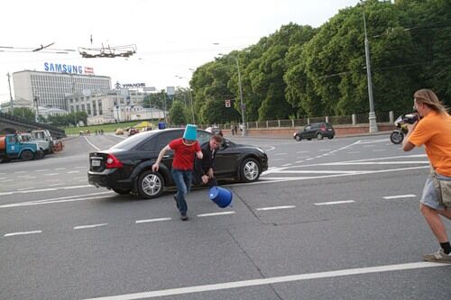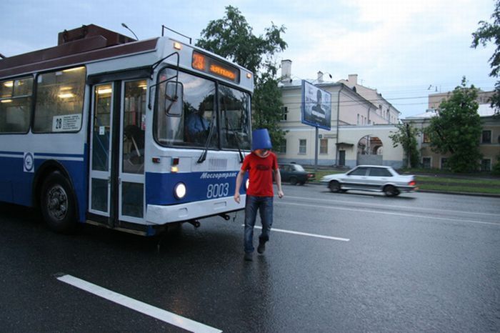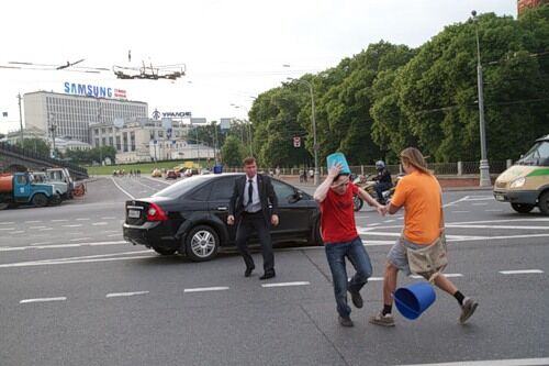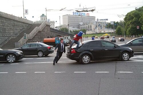 Al ver el coche que llevaba en el toldo la sirena azul intermitente (la señal que usan los burócratas para pedir que les abran el paso), el activista cruzó peligrosamente la calle, se acercó al vehículo, sacó un cubo azul de su bolsa y se lo puso en la cabeza antes de trepar al capó. Pero lo mejor es que lo veas por ti mismo: