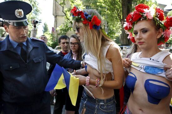 Lo más curioso es que el movimiento parece que se expande. Hace unos días nos enteramos de que la policía arrestaba a una activistas ucranianas del movimiento feminista Femen, que habían pintado sus pechos de azul y habían empezado a protestar en apoyo de la Sociedad de los cubos azules frente a la Embajada rusa en Kiev, el 27 de mayo.