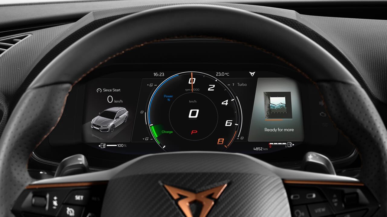 En cuanto a la oferta mecánica, el primer escalón es una unidad híbrida enchufable compuesta de un motor de gasolina turboalimentado (TSI) de 1.4 litros de 150 CV y otro eléctrico de 115 CV. Combinado con una transmisión automática de doble embrague DSG de siete velocidades y una batería de 13 kWh, es capaz de generar 245 CV y 400 Nm. Si buscas ser eficiente, el Cupra León Sportstourer e-Hybrid puede recorrer hasta 60 kilómetros sin usar gasolina, aunque si quieres disfrutar de todas sus prestaciones, todavía te sorprenderá con un sprint de 0 a 100 km/h en menos de siete segundos y una velocidad máxima de 250 km/h.