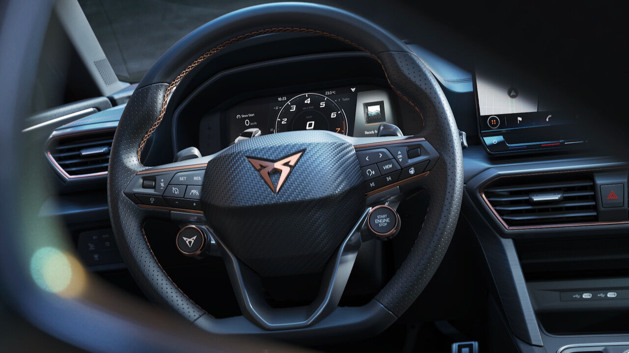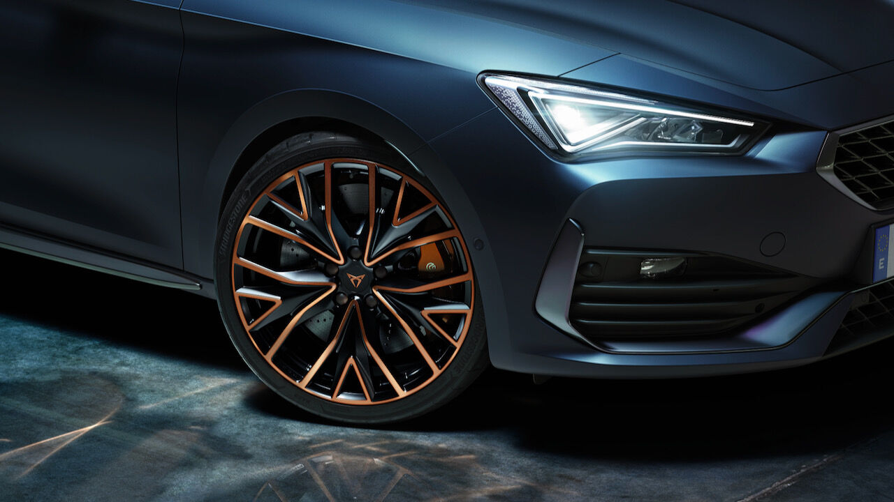 El Cupra León VZ Cup alemán se distingue del resto por tener unas llantas de 19 pulgadas Exclusive II en dos tonos, además de los faldones laterales acabados en Dark Aluminium y el alerón trasero en fibra de carbono. Aunque probablemente lo más destacado esté en su interior, pues se suman los asientos deportivos Supersport con un acabado más racing gracias a la tapicería de cuero CUP en negro o azul petróleo. Va a juego con el volante Supersport con selector Cupra o con el salpicadero en negro y símil de cuero.
