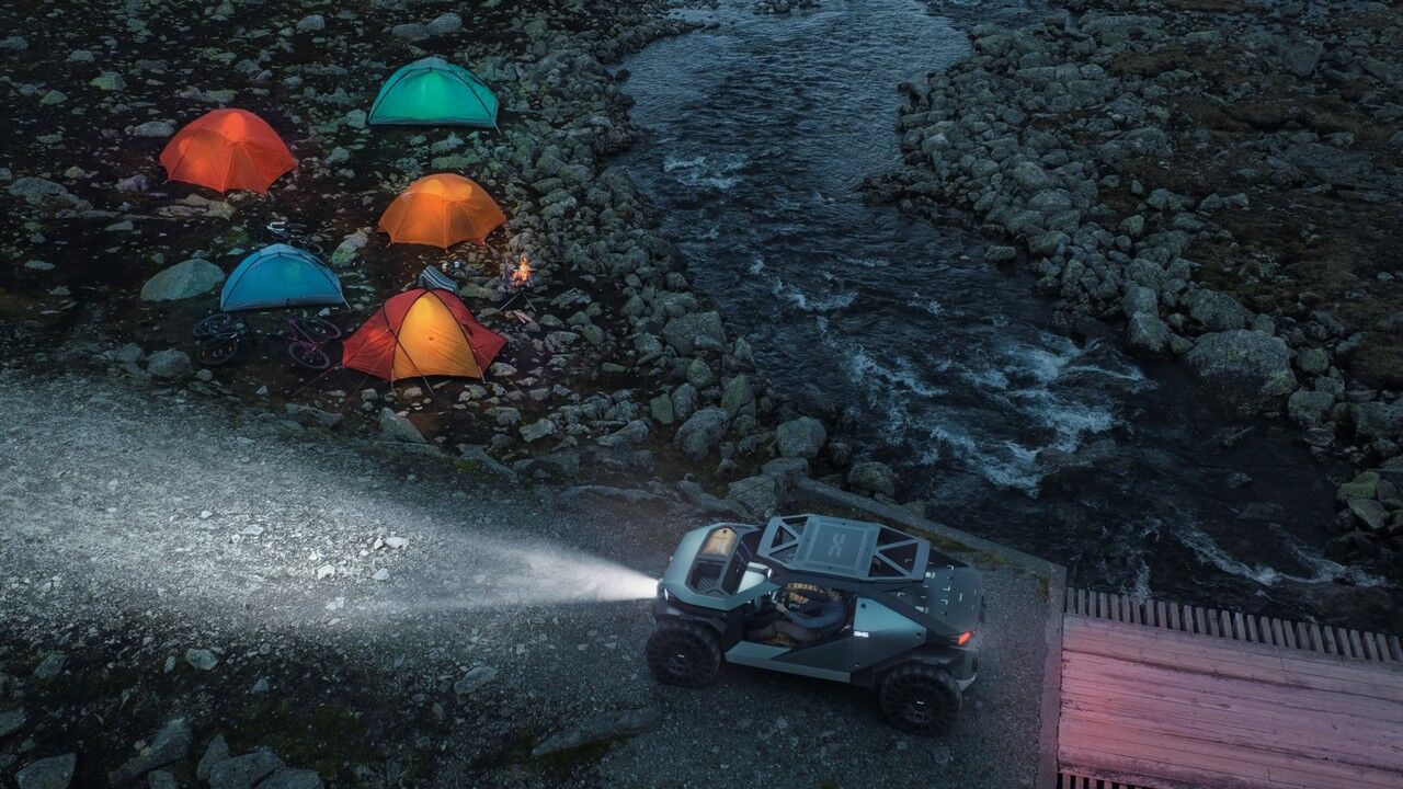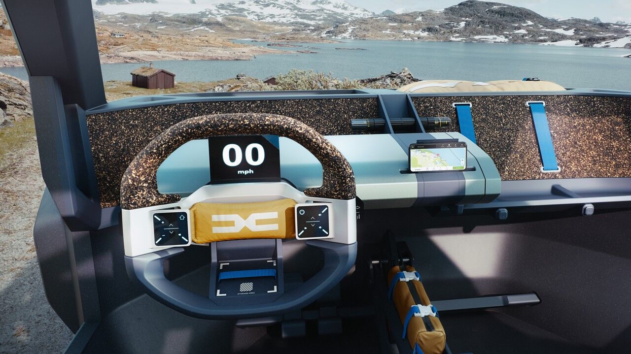 Pero el Dacia Manifesto quiere ser una forma de escapar de ese futuro. El prototipo no tiene puertas ni ventanillas, lo que, según la marca, “no deja barreras entre los pasajeros y el medio ambiente”. La cubierta de los asientos de estilo retro, al principio, parece ser un nailon extraño y robusto, porque lo es: cada cubierta es un saco de dormir, listo para tu próxima expedición al aire libre. Uno se encuentra inmerso en la naturaleza. Y para las actividades al aire libre, nada mejor que una superficie de trabajo que pueda desplegar sus funciones.