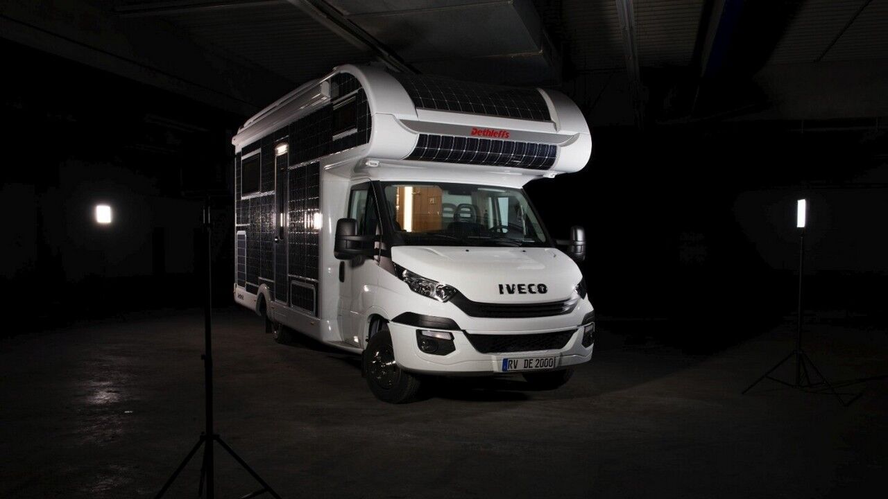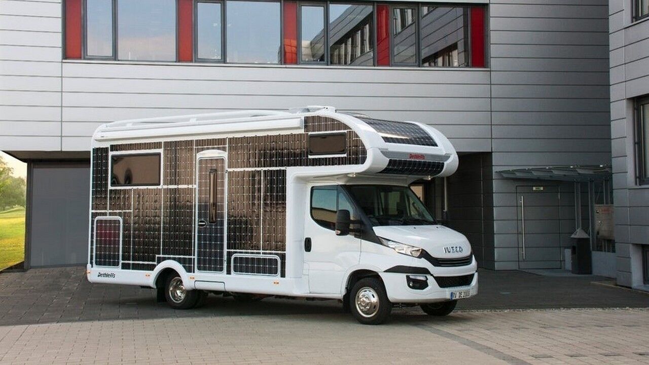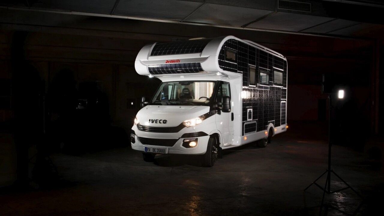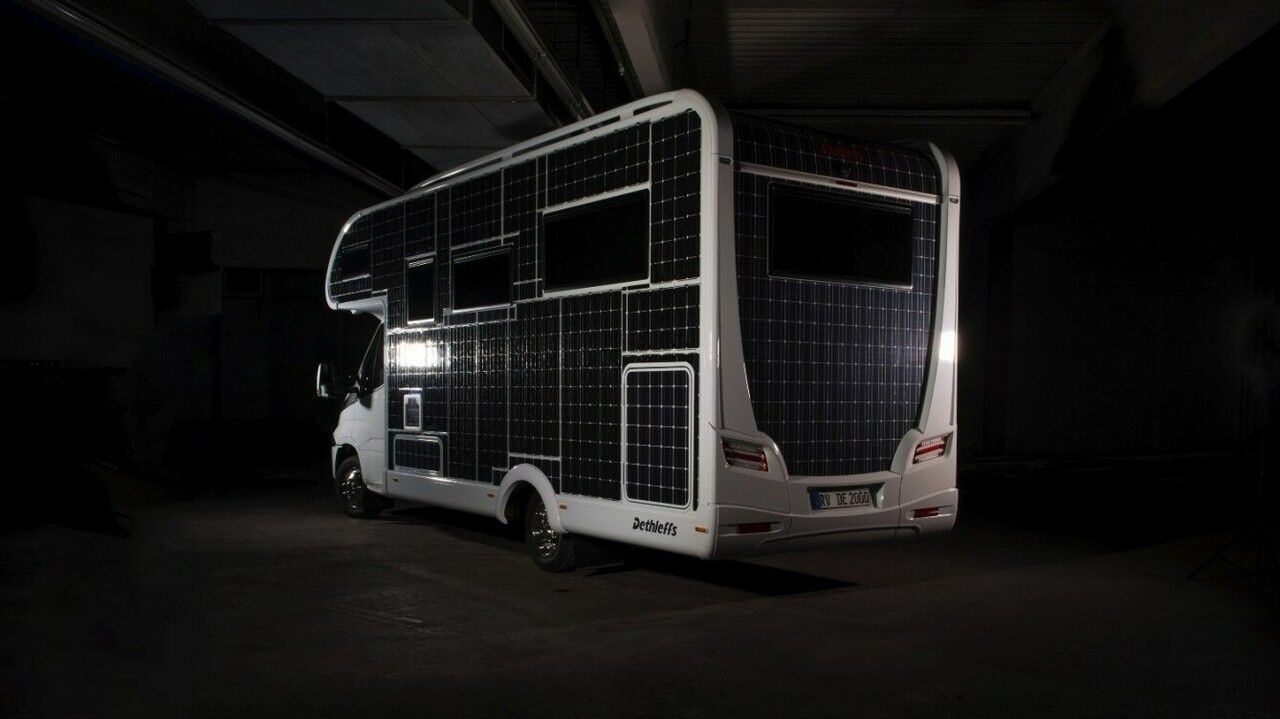 La página web de Dethleffs ya no presentan mucha información sobre el prototipo, pero según New Atlas, alrededor de 31 metros cuadrados de paneles solares se habían colocado a lo largo de toda la carrocería de la autocaravana, pudiendo generar hasta 3.000 vatios de jugo eléctrico para el uso y disfrute de sus ocupantes. Para comprender cuánta cobertura significa esto, solo hay que ver que, realmente, hay muy poco espacio sin cubrir que no incluye ningún panel solar a parte de la cabina y los bajos del vehículo. Imagina hacerle un roce al aparcarla.