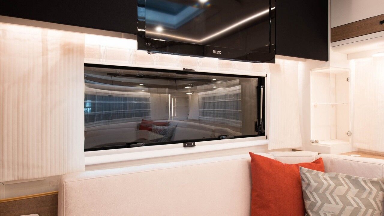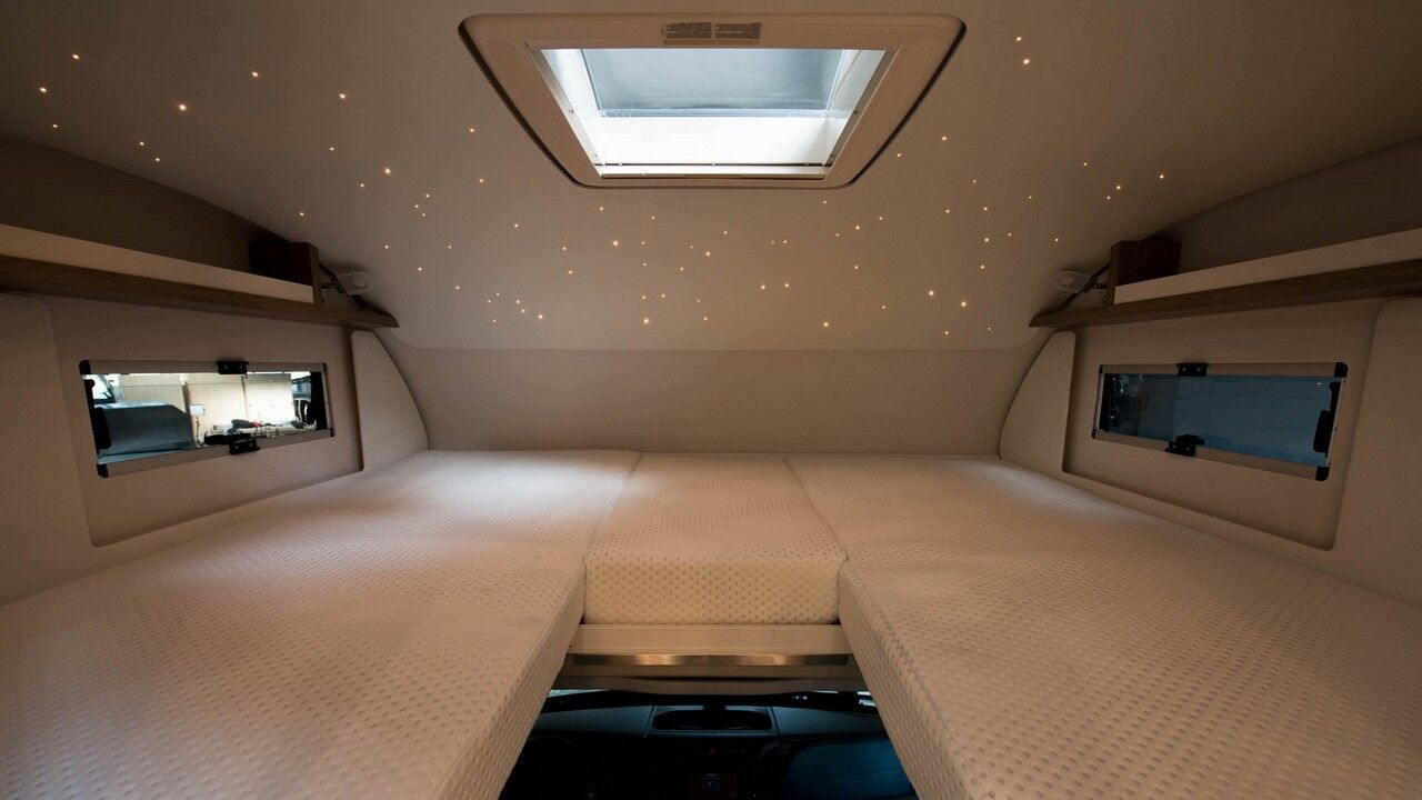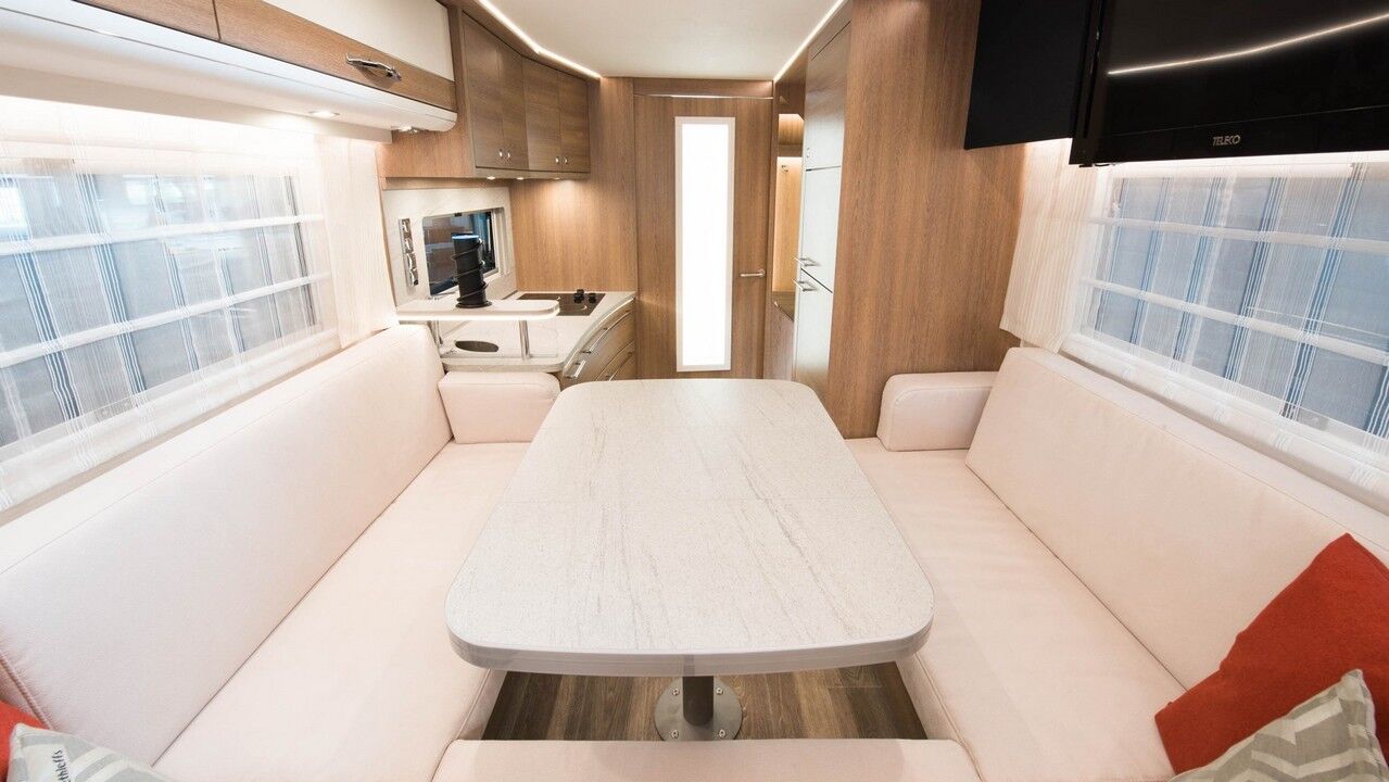 Incluso algunas autocaravanas hoy en día no alcanzan el mismo nivel de comodidad y estilo. Al ingresar al hábitat, el lado izquierdo de la casa rodante tiene un comedor modular en forma de “U” que se apoya contra la configuración de la cocina y el frigorífico/congelador. A la derecha, se puede percibir un baño con una ducha. Pero eso no es todo, frente a él hay otro baño que incluye un inodoro, lavabo y tocador. Más a la derecha está la cabina, pero arriba se encuentra otra área para dormir con dos camas gemelas y opción a una generosa cama doble.