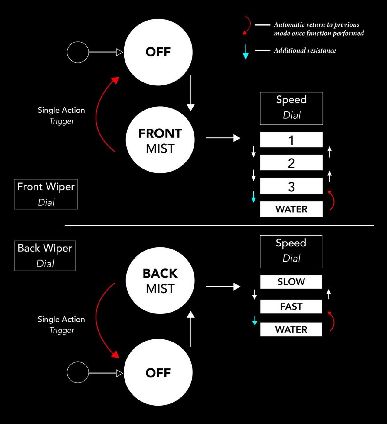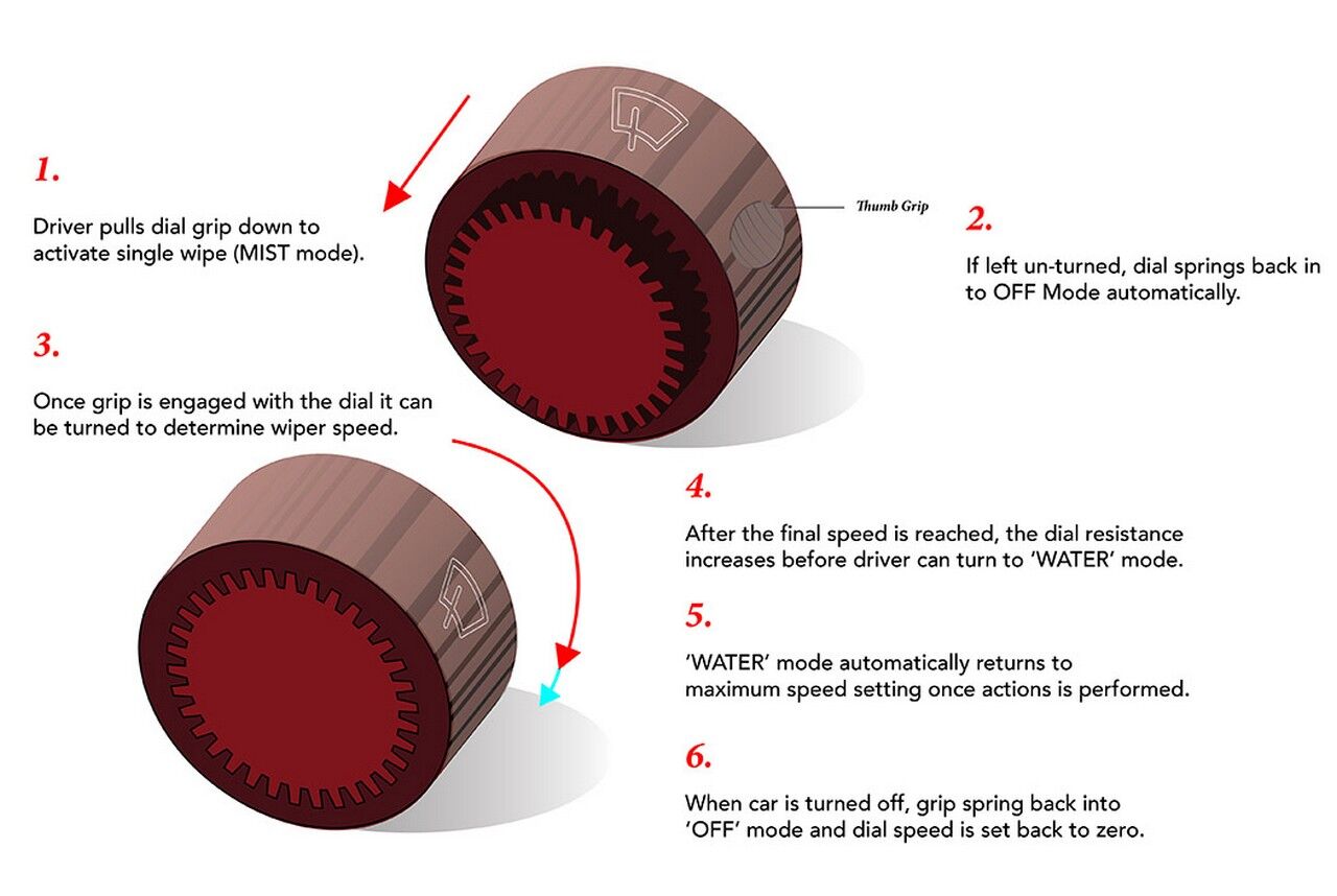 Este diseño conceptual propone colocar dos pequeños mandos en el volante, en los laterales superiores de la circunferencia. El izquierdo serviría para controlar el limpiaparabrisas trasero y el de la derecha para dirigir el limpiaparabrisas delantero. Para ambos casos basta con rotar ligeramente hacia abajo el mando giratorio para que los limpias hagan una pasada, en este caso el mando vuelve a la posición inicial.