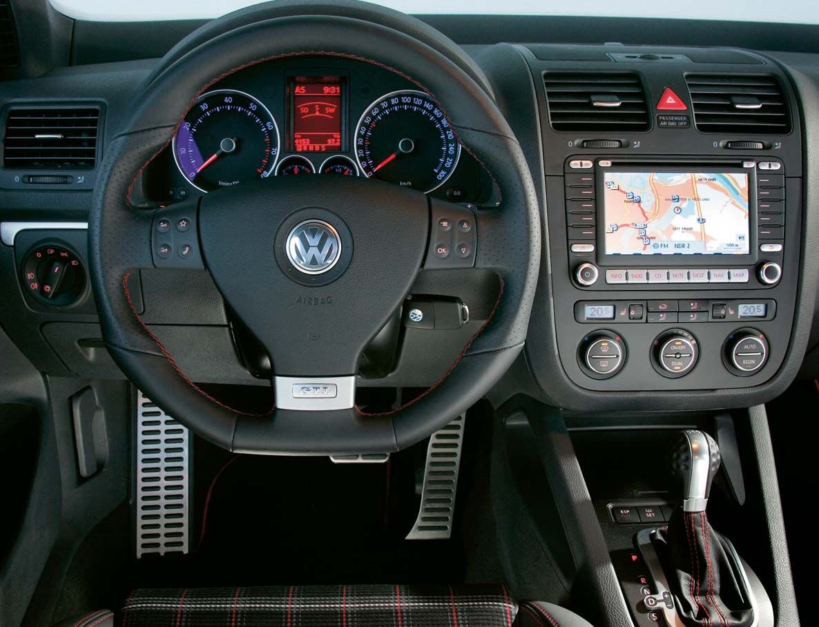 Un vistazo al interior revela en color aluminio el panel de ajustes del umbral, con el logotipo GTI, y los asientos Recaro deportivos de forma ergonómica. Estos también llevan el logotipo GTI de color rojo brillante, al igual que el respaldo del asiento trasero divisible. El cuadro de instrumentos se compone de relojes redondos con un aspecto moderno, de aluminio – un gran velocímetro y cuentarrevoluciones y menor temperatura del refrigerante y nivel de combustible. La consola central y las manijas interiores de las puertas están acabados con embellecedores de aluminio pulido.