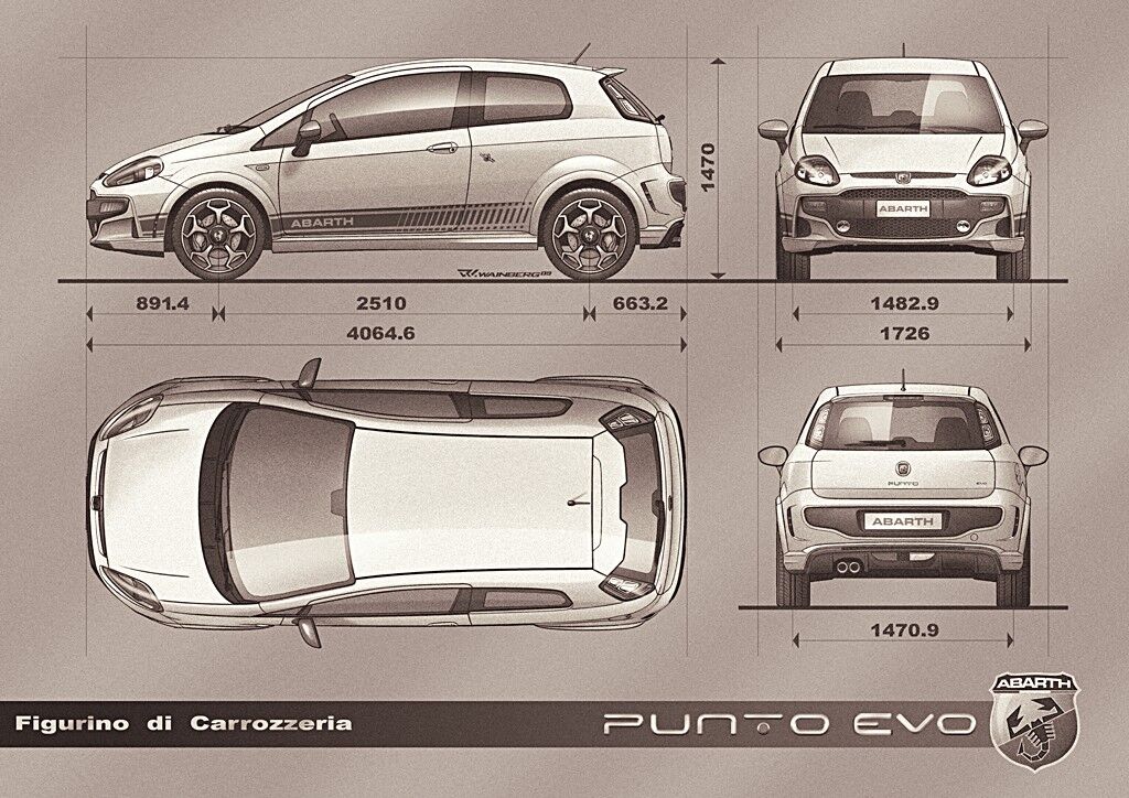 Respecto de la versión Fiat, el parachoques delantero ha sido ensanchado, incorporando también el acoplamiento con los elementos laterales, mientras que la enseña negra delantera ha sido moldeada en profundidad para dar espacio a los orientadores laterales, que conducen y corrigen la toma del aire, mejorando sensiblemente el flujo aerodinámico lateral, como sucede ya en la versión rally. Atrás tenemos un parachoques completamente reestudiado y los extremos del escape son dobles y de mayor diámetro, un claro homenaje a la historia Abarth. El spoiler ha sido completamente modificado tanto en el color como en el volumen: en efecto, la nueva forma alargada y ahusada aumenta las prestaciones en los valores de cx y CZ, confiriendo al Abarth Punto EVO aún mayor estabilidad.