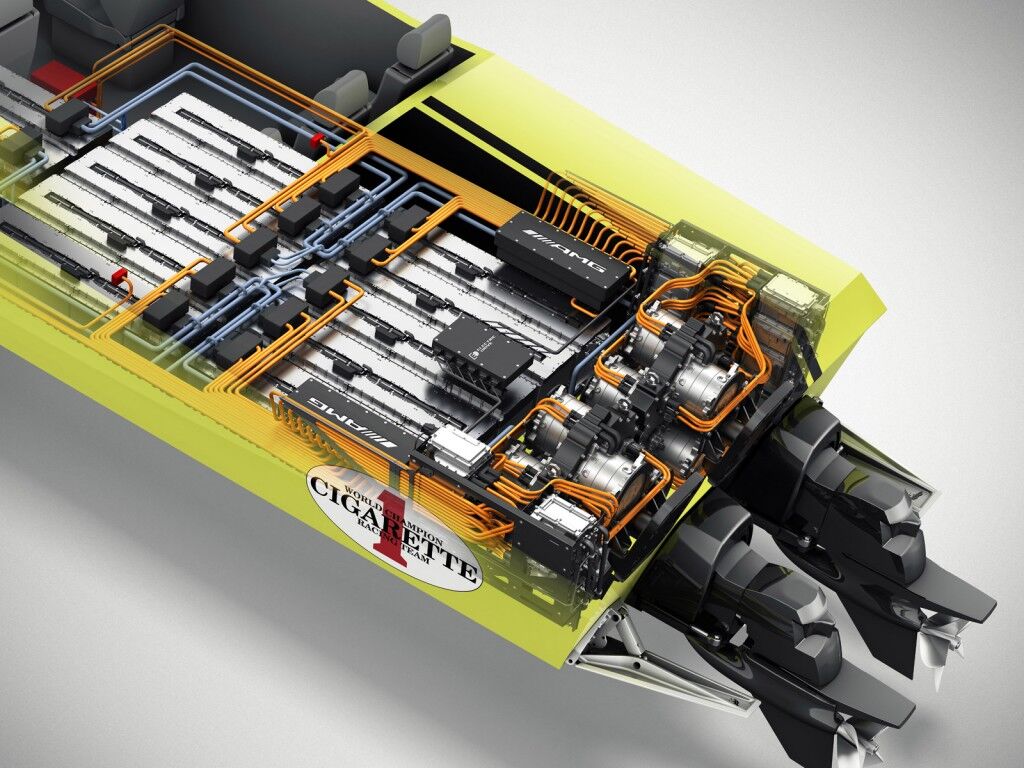 Se trata de una adpatación del fabuloso Mercedes SLS AMG Electric Drive, pero multiplicado a un nivel nunca visto. La embarcación, de propulsión 100% eléctrica, tiene una potencia de 1.656 kW (2.252 CV) con un par motor de 3.000 Nm que le propulsan hasta una velocidad máxima de 160 km/h.