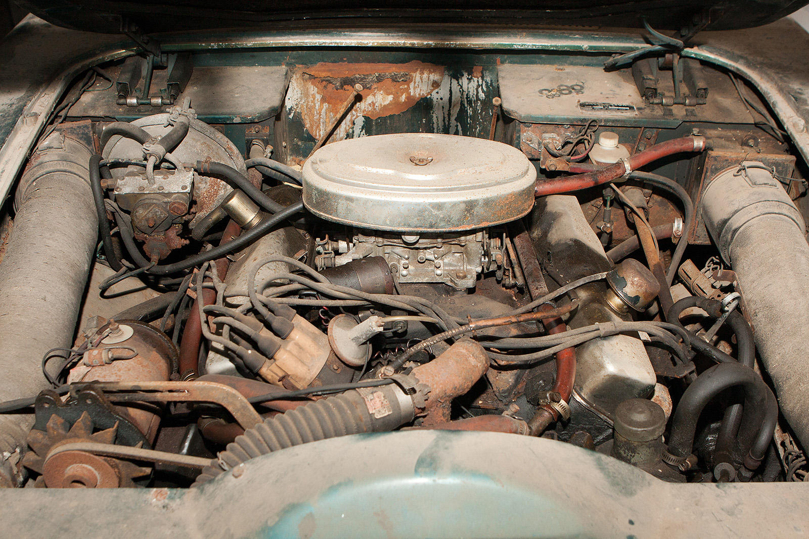 Esta persona lo mantuvo en su granero de Missouri desde entonces, como en una cápsula del tiempo, tal y como se había entregado en el concesionario. Pintado en azul «pavo real», con interior de cuero gris y unas preciosas llantas multiradio. Y, por supuesto, el motor V8 Chrysler de 6,3 litros original, que apenas recorrió 31.152 millas (51.134 km).