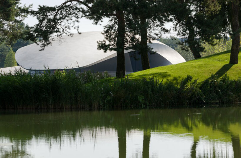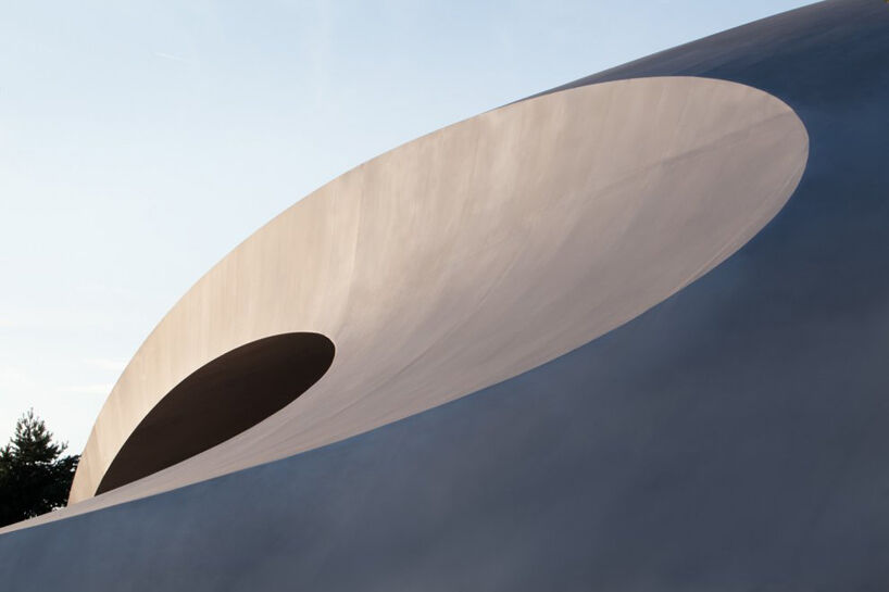 Las líneas curvas y sorprendentes hacen del pabellón una escultura dinámica cuyas características derivan de la imagen de la marca Porsche. Diseñado por HENN, la estructura capta el flujo dinámico de la conducción, con una construcción de piel sin costuras. Sus líneas toman la velocidad y el acto de frenar para definir las largas curvas. Un revestimiento de acero inoxidable de acabado mate forma el vibrante exterior de esta estructura, creando la impresión de una unidad homogénea, mientras que genera una apariencia continuamente cambiante en función de la luz y de las condiciones climáticas.