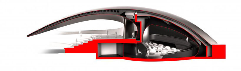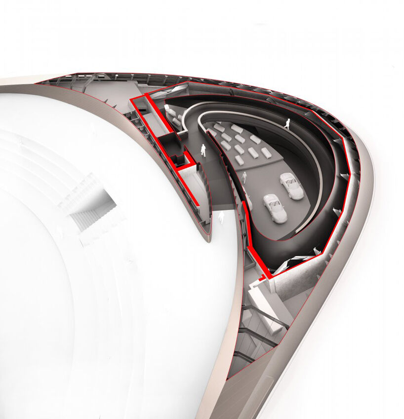 En el interior del pabellón se abre un espacio concentrado que permite a los visitantes experimentar la marca Porsche y su historia, dejando de lado los límites convencionales y las restricciones a la percepción. La rampa elíptica curva abraza el principio dinámico de la arquitectura y conduce a los visitante a los espacios de exposición.