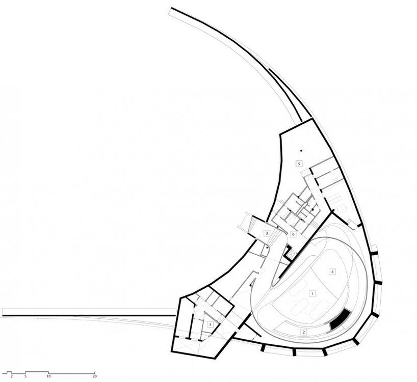 En el acceso, el pabellón tiene 25 metros de voladizo sobre la superficie de la laguna. Debajo de esta cubierta se abre una gran cubierta asimétrica, generando un espacio exterior protegido. Este espacio está conectado visualmente con el paisaje circundante, y forma a la vez su propio recinto acústico, ofreciendo asientos para cientos de personas.