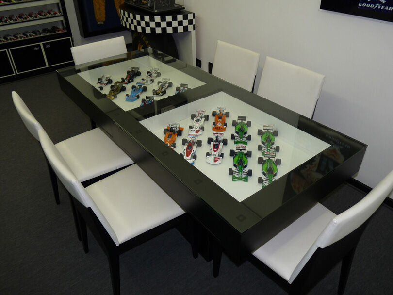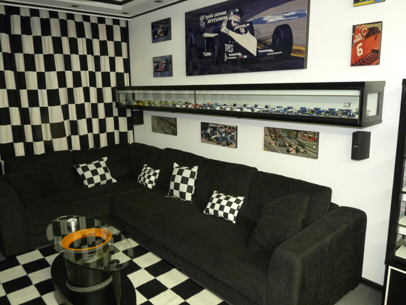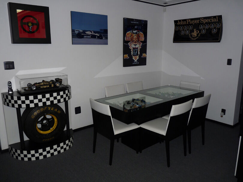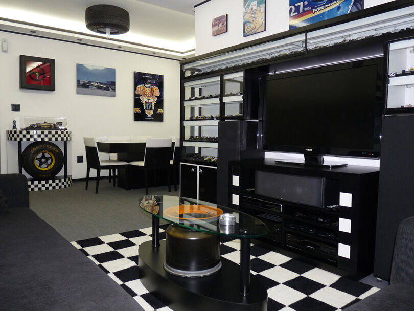 Michel compartió con todos los usuarios del foro F1M las fotos de su casa. No falta detalle: desde la cocina con un suelo «bandera de cuadros» (y las sábanas de su habitación), pasando por las luces propias de la Fórmula 1. Las mesas, también incluyen detalles como neumáticos o llantas y una de ellas es al mismo tiempo una vitrina para más maquetas.