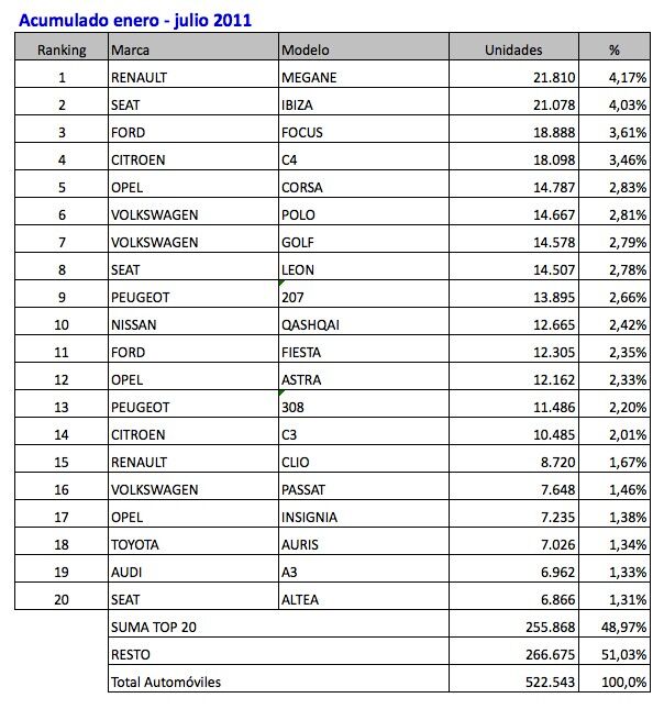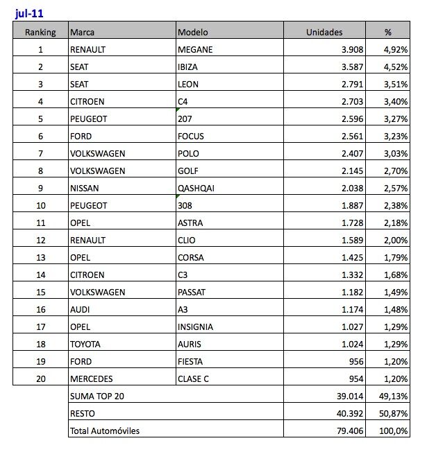 Tablas de cifras de coches más vendidos: