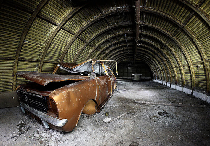 El coche icónico, que al parecer se utilizaba para viajar por la factoría, entonces en plena en expansión fue abandonado por los trabajadores a finales de 1970 en los túneles bajo la fábrica, después de sufrir algún daño (se cree que hubo un fallo al cargarlo a un contenedor de almacenamiento y los trabajadores lo escondieron en lugar de enviarlo para chatarra).