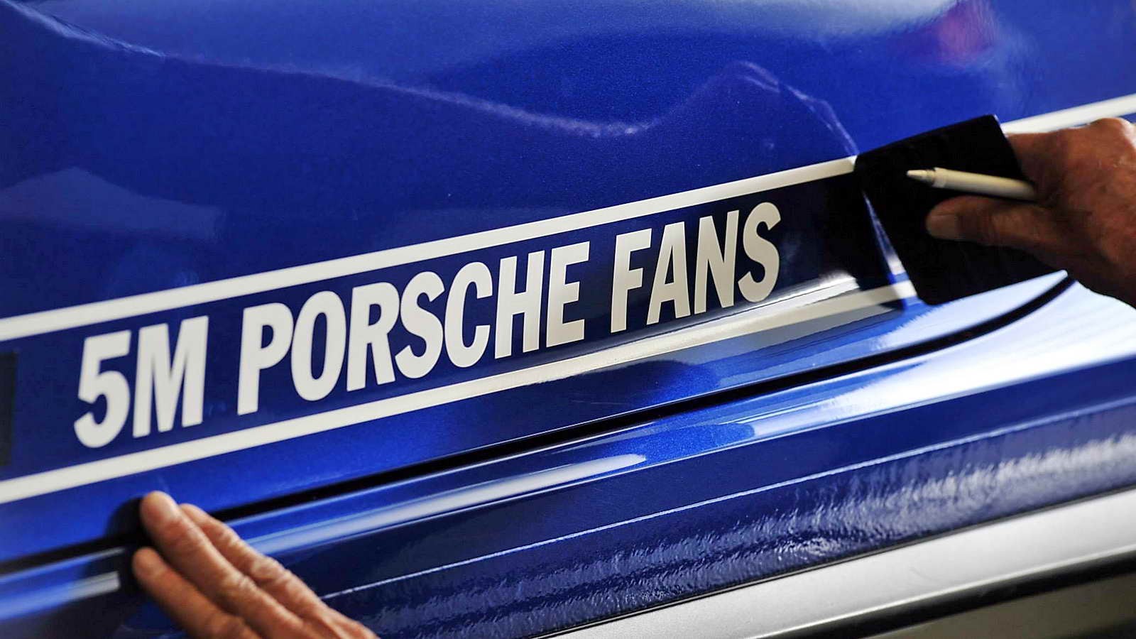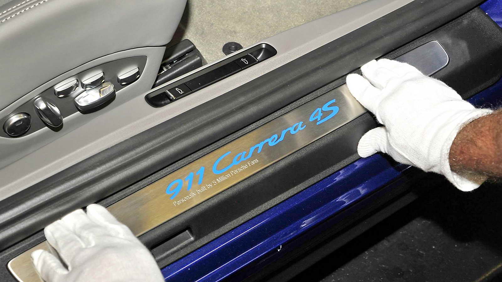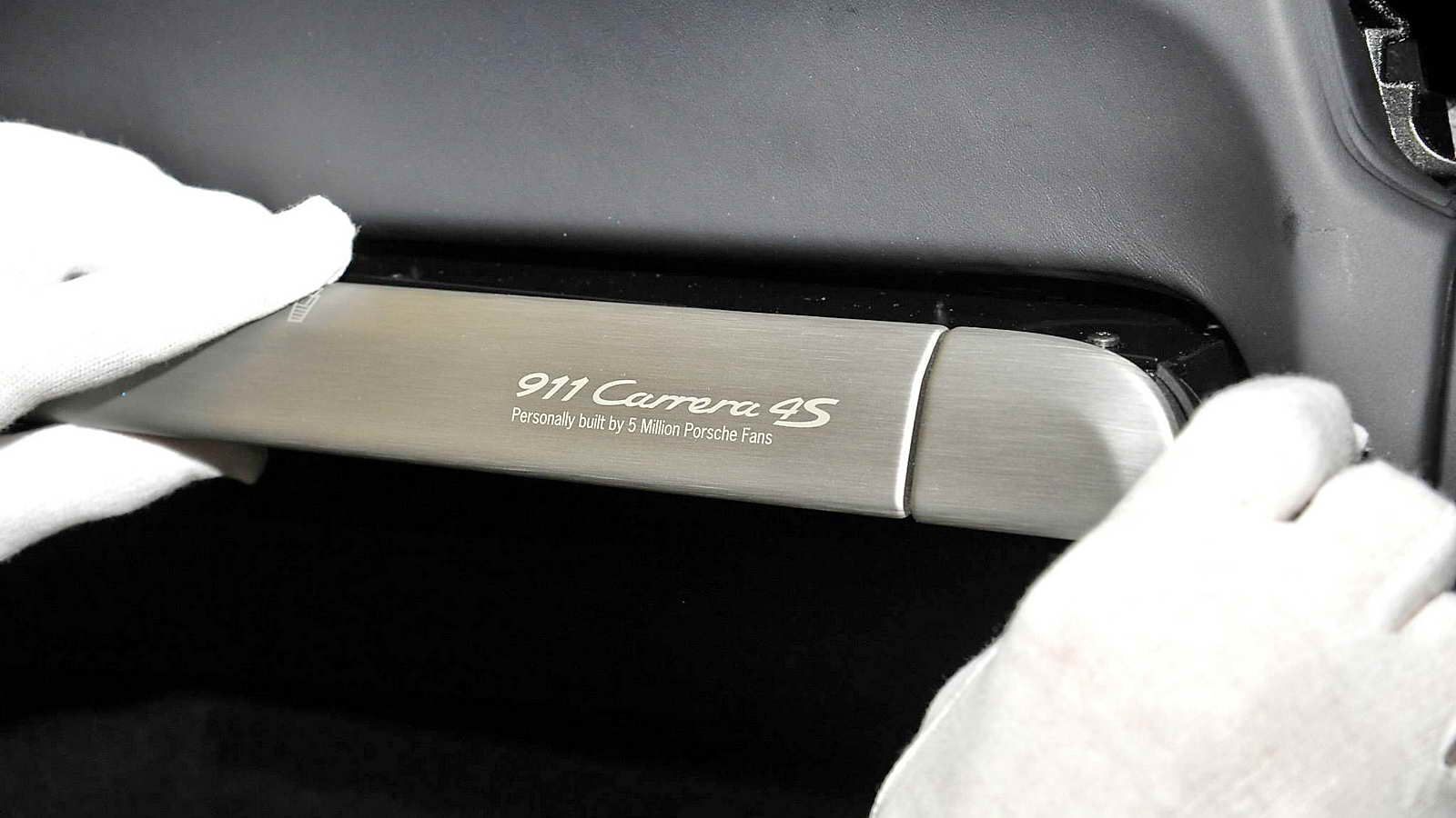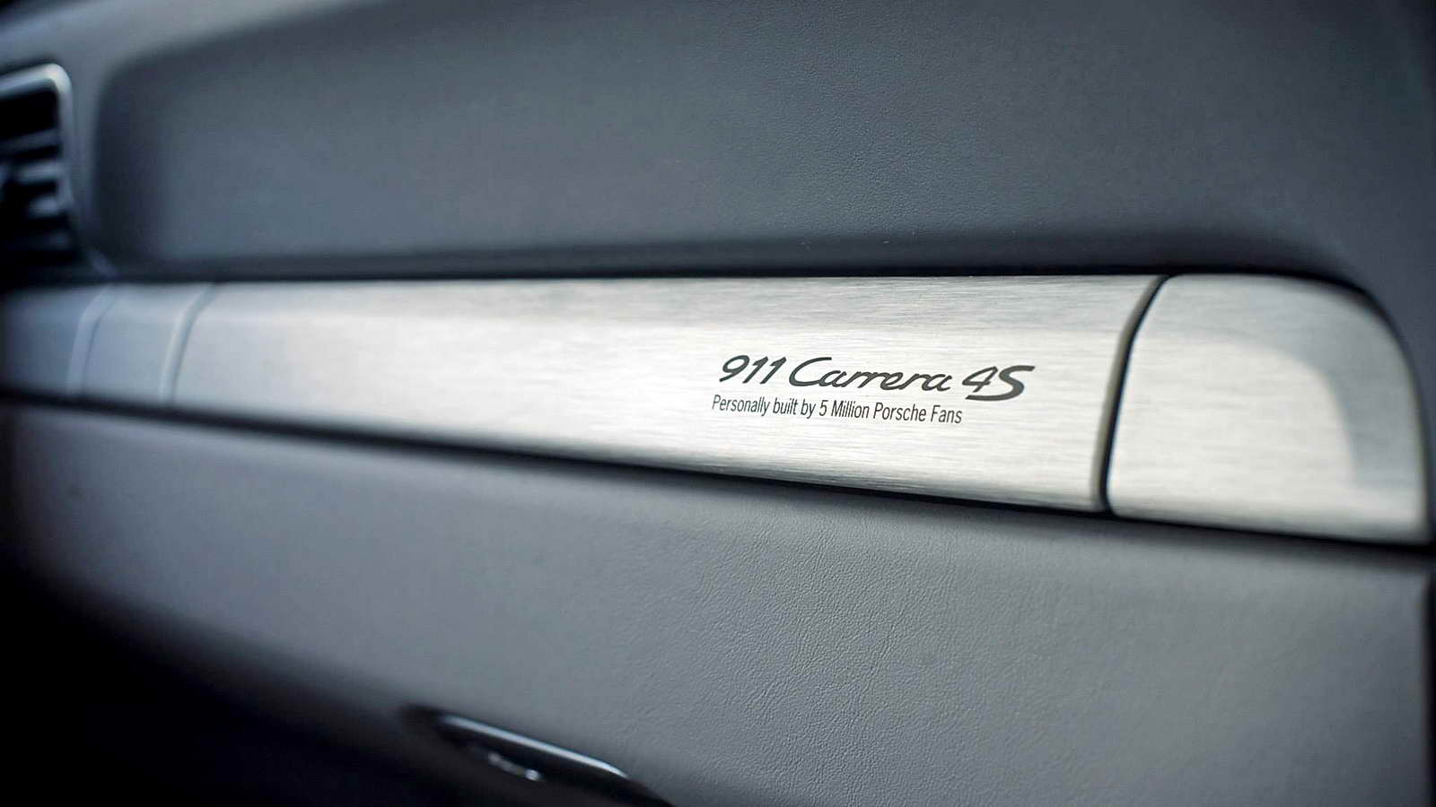 En el exterior no puede pasarse por alto tampoco unas franjas adhesivas, realizadas específicamente para la ocasión, dispuestas en la parte inferior de las puertas con el lema «5M Porsche Fans». Mientras que si abrimos esas mismas puertas, en su umbral destacan unas placas de aluminio pulido, donde se ha grabado, junto a la denominación del modelo la reseña «Personally built by 5 Million Porsche Fans», idéntica a la que figura también en otra plancha de aluminio cepillado, en el salpicadero. Otro detalle, que convierte a este deportivo en un modelo aún más exclusivo es la iluminación azul dispuesta en la parte inferior de las puertas que se ve reflejada en las placas anteriormente mencionadas.