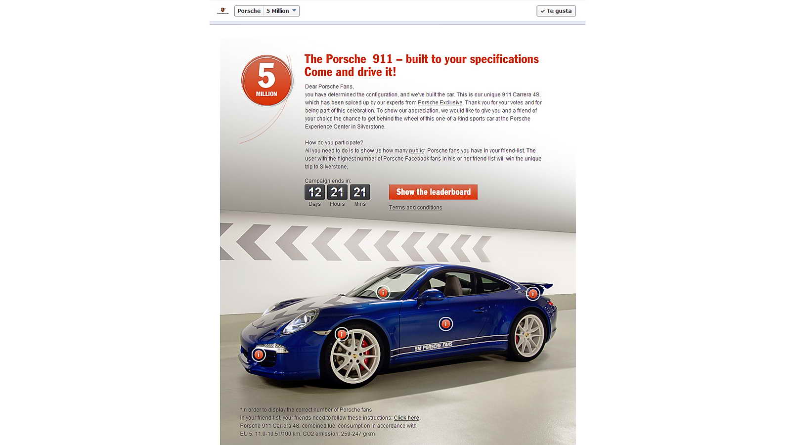 No se alcanzan 5 millones de fans en Facebook todos los días. Quizá para algún ídolo juvenil o un cantante de moda pueda parecer hasta relativamente sencillo, pero si hablamos de una marca de coches, y más si se trata de un fabricante de superdeportivos como Porsche, ya es más complicado. Por tanto ¿qué mejor forma de celebrar el haber llegado a esa cifra que hacer partícipes a todos ellos del diseño de una especialísima versión conmemorativa del Porsche 911 Carrera 4S?