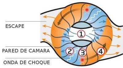 - La presión alcanza un límite y la mezcla hace ignición. Esto produce una expansión violenta de la mezcla aire-combustible que empuja las paletas internas en la dirección del movimiento, gracias a lo cual finalmente logra salir (4).