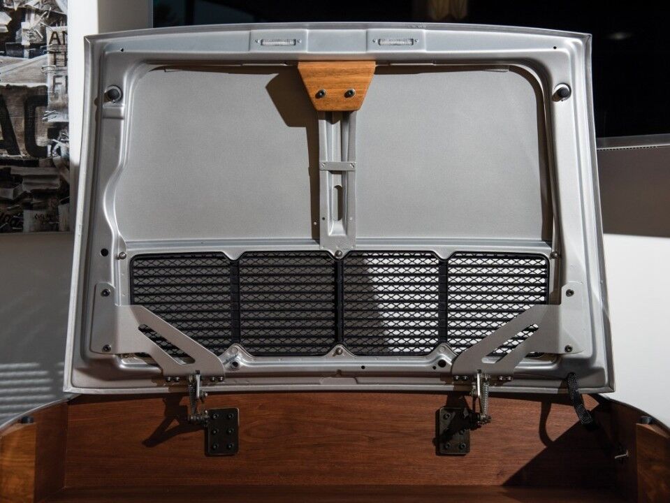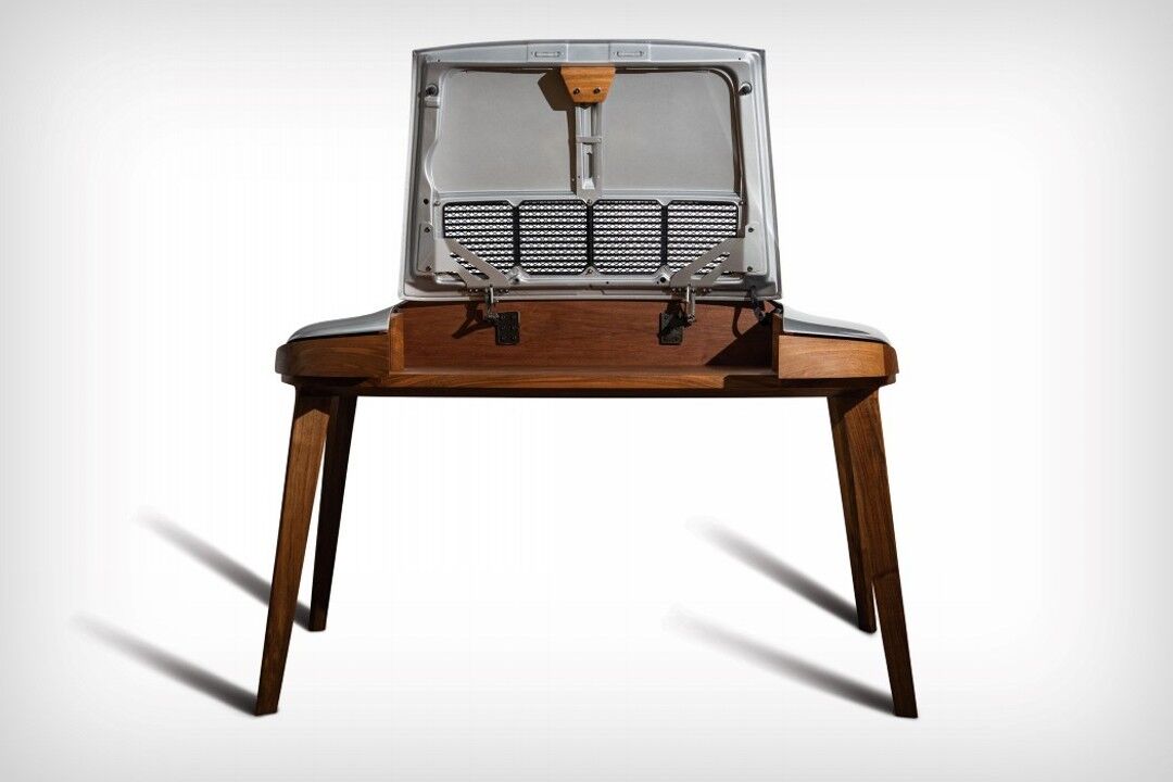 El escritorio presentado aquí está hecho a medida con madera de nogal americano y construido con los paneles de un Porsche 911 de segunda generación (930), terminados en plata ártica. El conjunto fusiona maravillosamente los contornos del deportivo alemán, tomando la parte trasera del coche y convirtiendo su capó en una superficie de escritura que se pliega como un gabinete para almacenar tus artículos papelería en dos cajones.