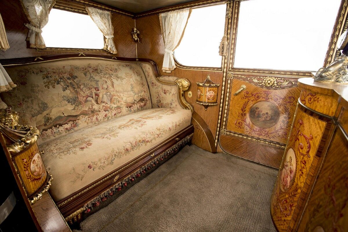 En el techo se pintaron querubines jugando, se incluyeron cornisas doradas talladas en el techo, asientos laterales plegables y lo más impresionante: un mueble bar de madera tallado en el que se podía tomar una bebida durante el trayecto de ensueño. Jarrones de porcelana, un pequeño reloj francés...todo el lujo imaginable que puede caber en el interior de un coche. ¿El coste? 6.500 libras más las 4.500 empleadas en su interior, el Rolls-Royce más caro hasta la fecha. Para la época una auténtica fortuna; con 500 libras se podía comprar una casa en Reino Unido.