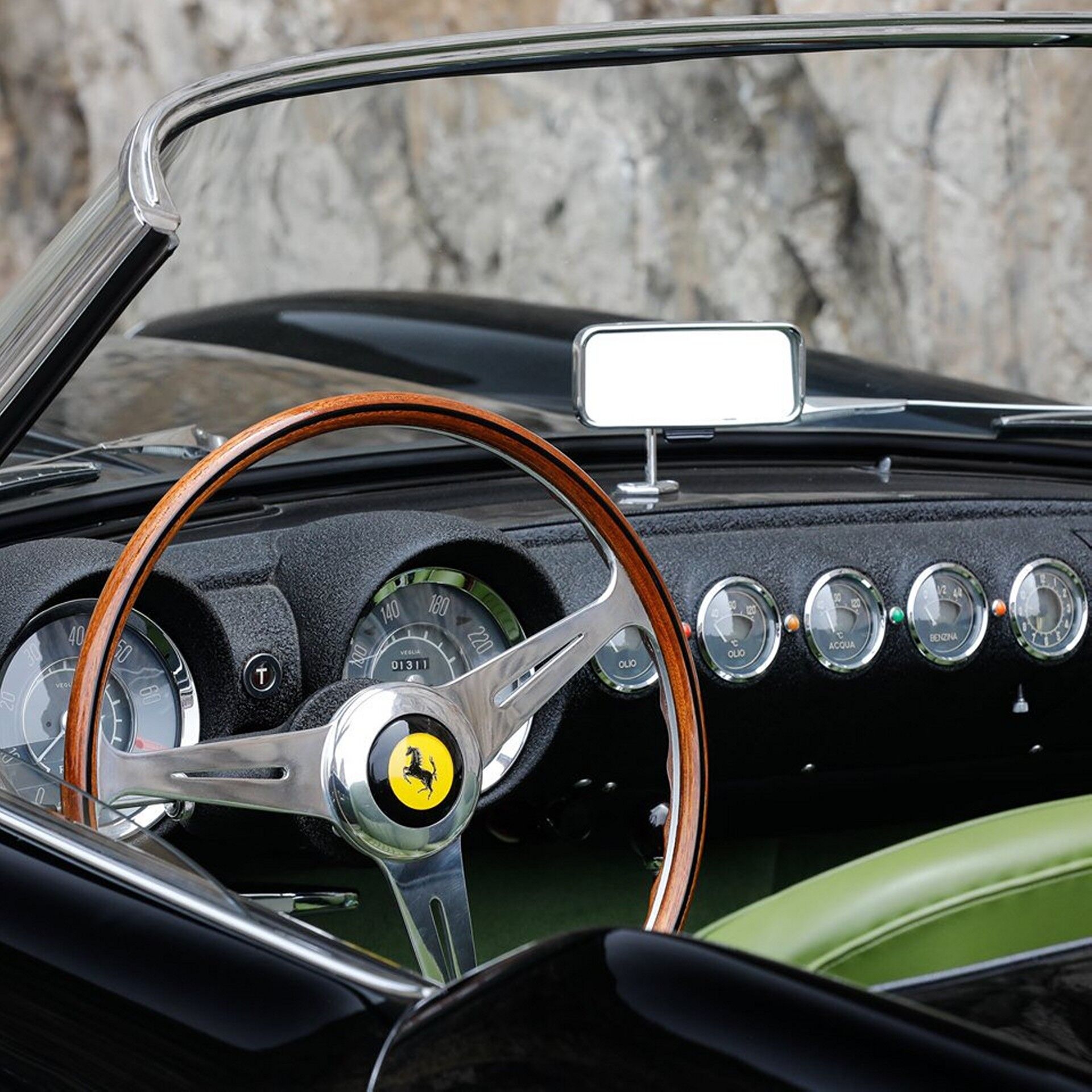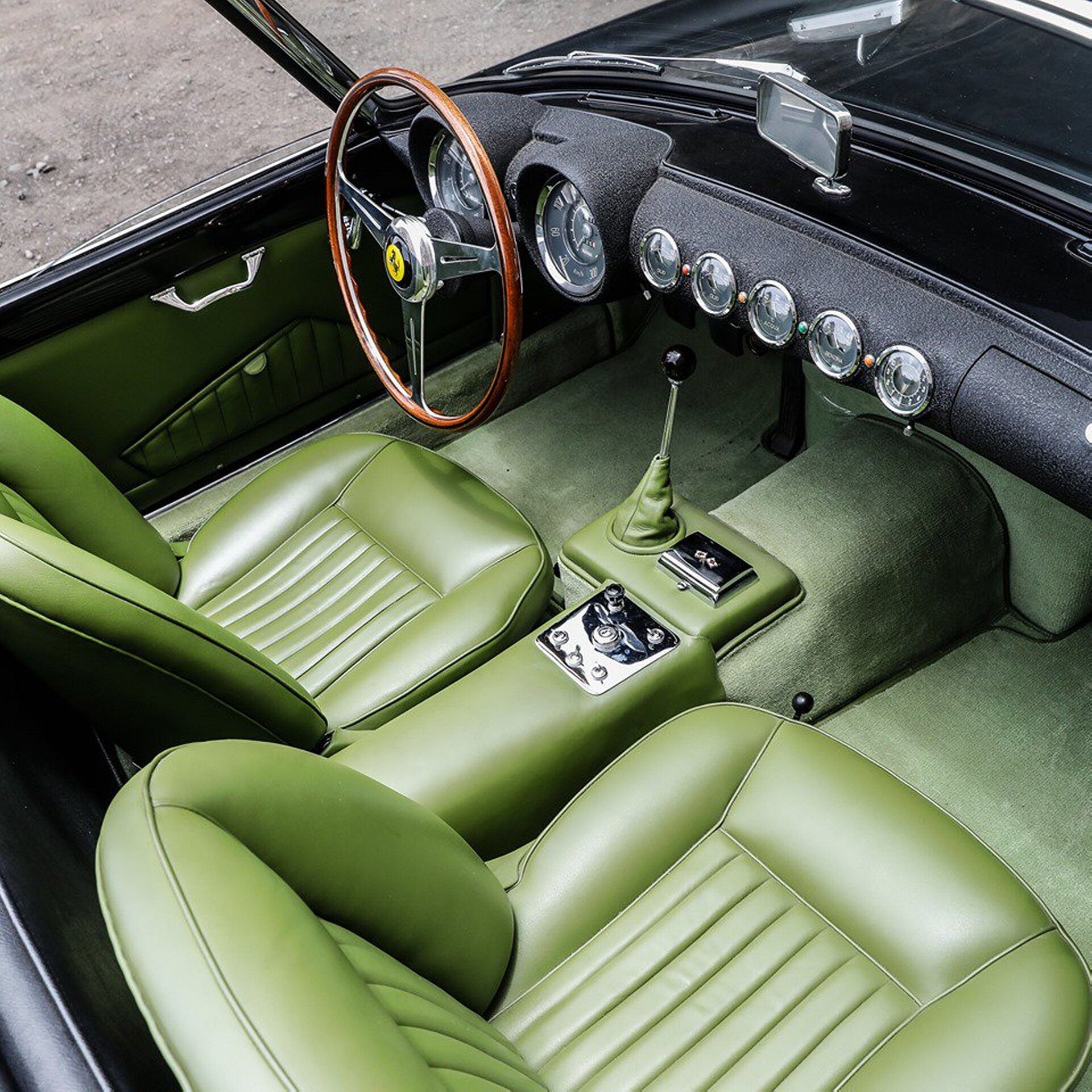 Con la excepción de la mitad superior del tablero de instrumentos, el habitáculo está envuelto completamente en cuero verde. Incluso hay alfombrillas verdes. Entendemos que el color sea del gusto de todos, pero ciertamente hace que este Ferrari 250 GT destaque. Se dice que el este vehículo selló las facturas por unos 13.000 euros en su día, algo que parece no soprender hasta que ajustas inflación y asciende la cifra por encima del medio millón de euros.